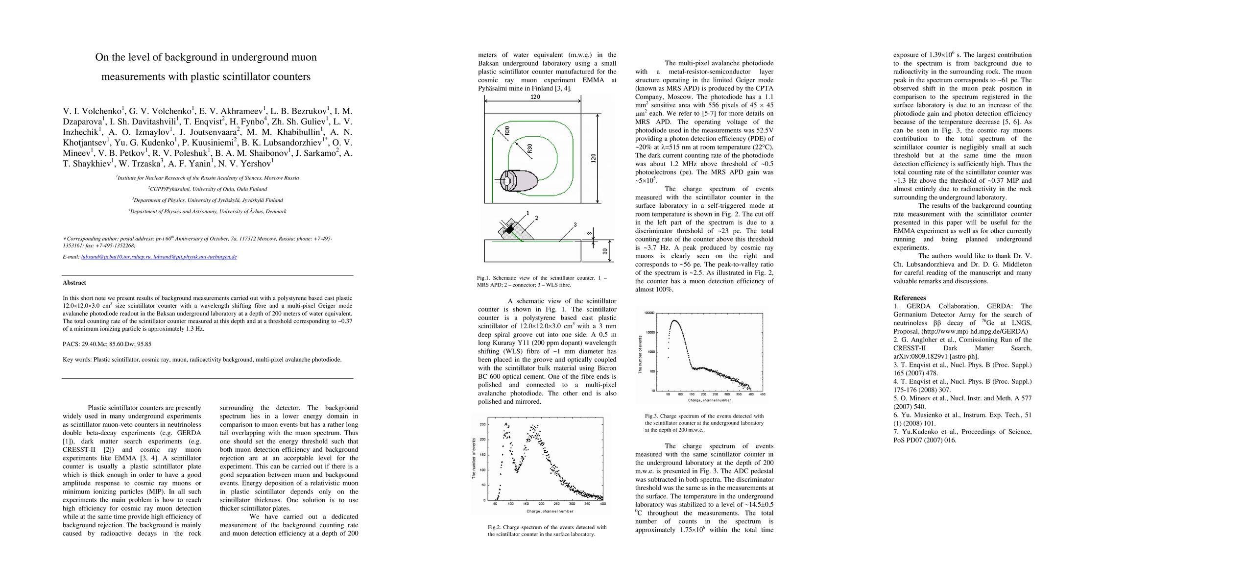 In this short note we present results of background measurements carried out with a polystyrene based cast plastic 12.0x12.0x3.0 cm^3 size scintillator counter with a wavelength shifting fibre and a multi-pixel Geiger mode avalanche photodiode readout in the Baksan underground laboratory at a depth of 200 meters of water equivalent. The total counting rate of the scintillator counter measured at this depth and at a threshold corresponding to ~0.37 of a minimum ionizing particle is approximately 1.3 Hz.
