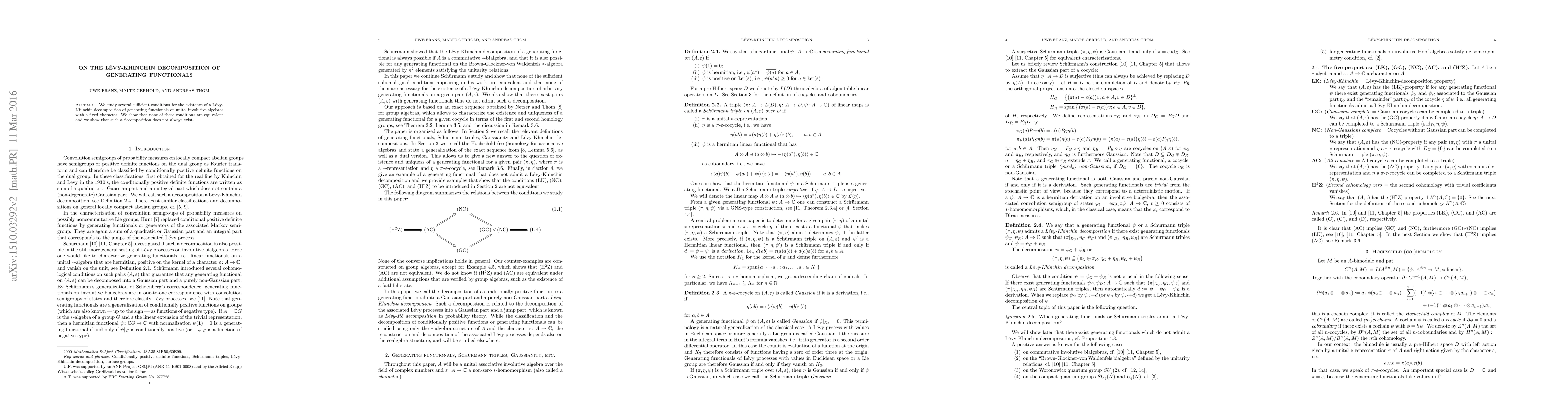 We study several sufficient conditions for the existence of a L\'evy-Khinchin decomposition of generating functionals. We show that none of these conditions are equivalent and we show that such a decomposition does not always exist.