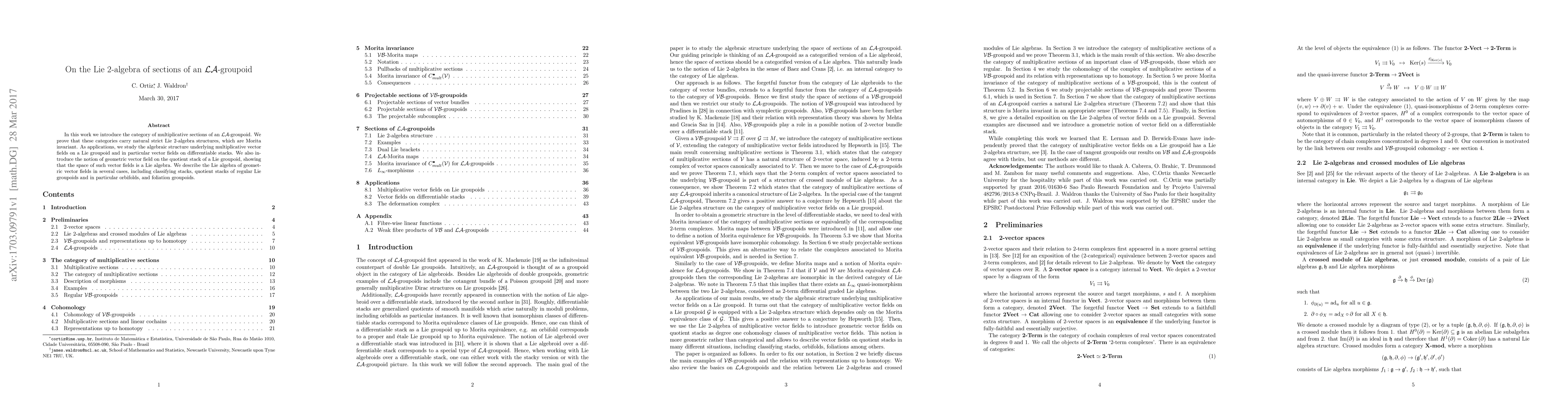 This paper introduces the category of multiplicative sections of an LA-groupoid, proving it carries natural strict Lie 2-algebra structures that are Morita invariant. It applies these structures to study vector fields on Lie groupoids and differentiable stacks, and describes the Lie algebra of geometric vector fields on various quotient stacks, including orbifolds and foliation groupoids.