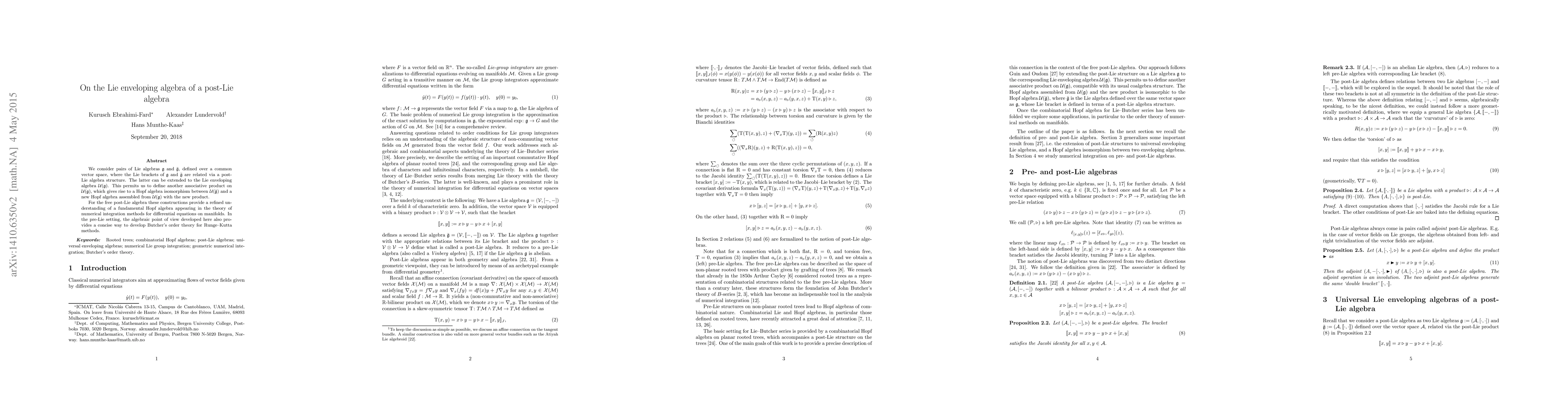 The paper explores the relationship between pairs of Lie algebras \(g\) and \(\bar{g}\) over a common vector space, where their Lie brackets are related via a post-Lie algebra structure. This structure extends to the Lie enveloping algebra \(U(g)\), leading to a new associative product and a Hopf algebra isomorphism between \(U(\bar{g})\) and a new Hopf algebra constructed from \(U(g)\) with the new product.