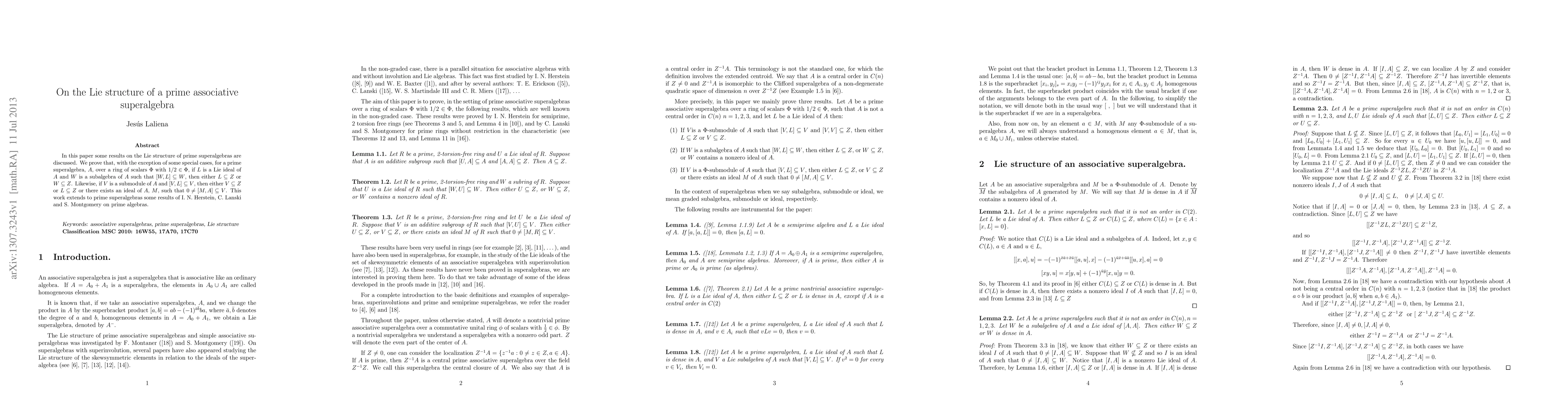 In this paper some results on the Lie structure of prime superalgebras are discussed. We prove that, with the exception of some special cases, for a prime superalgebra, $A$, over a ring of scalars $\Phi$ with $1/2\in \Phi$, if $L$ is a Lie ideal of $A$ and $W$ is a subalgebra of $A$ such that $[W, L]\subseteq W$, then either $L\subseteq Z$ or $W\subseteq Z$. Likewise, if $V$ is a submodule of $A$ and $[V, L]\subseteq V$, then either $V\subseteq Z$ or $L\subseteq Z$ or there exists an ideal of $A$, $M$, such that $0\not= [M,A]\subseteq V$. This work extends to prime superalgebras some results of I. N. Herstein, C. Lanski and S. Montgomery on prime algebras.