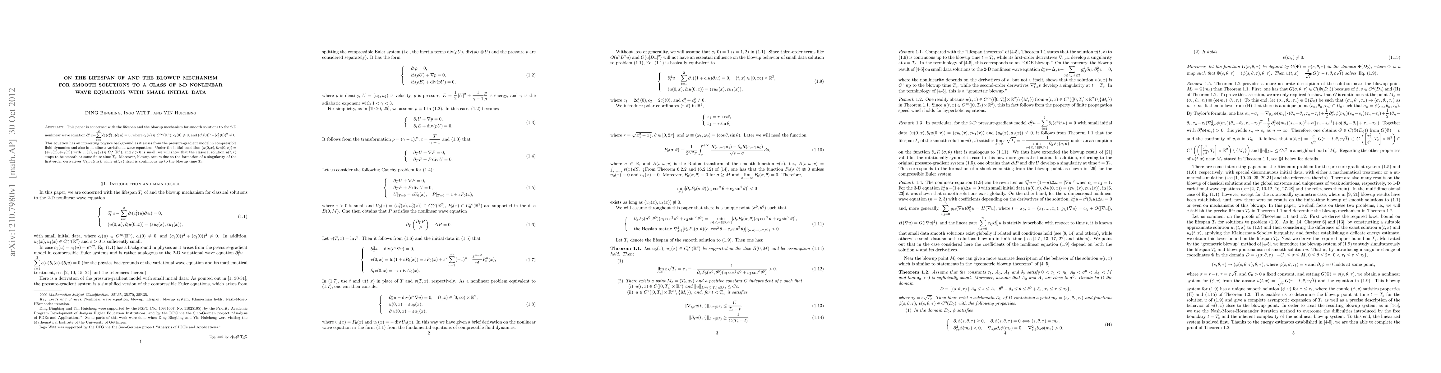 This paper is concerned with the lifespan and the blowup mechanism for smooth solutions to the 2-D nonlinear wave equation $\p_t^2u-\ds\sum_{i=1}^2\p_i(c_i^2(u)\p_iu)$ $=0$, where $c_i(u)\in C^{\infty}(\Bbb R^n)$, $c_i(0)\neq 0$, and $(c_1'(0))^2+(c_2'(0))^2\neq 0$. This equation has an interesting physics background as it arises from the pressure-gradient model in compressible fluid dynamics and also in nonlinear variational wave equations. Under the initial condition $(u(0,x), \p_tu(0,x))=(\ve u_0(x), \ve u_1(x))$ with $u_0(x), u_1(x)\in C_0^{\infty}(\Bbb R^2)$, and $\ve>0$ is small, we will show that the classical solution $u(t,x)$ stops to be smooth at some finite time $T_{\ve}$. Moreover, blowup occurs due to the formation of a singularity of the first-order derivatives $\na_{t,x}u(t,x)$, while $u(t,x)$ itself is continuous up to the blowup time $T_{\ve}$.