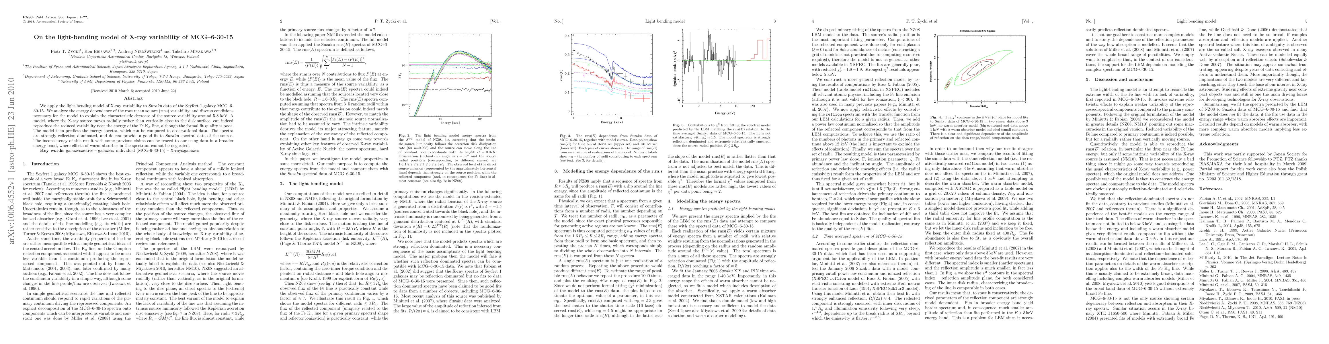 Researchers applied a light-bending model to X-ray variability of MCG-6-30-15, finding that a model where the source moves radially near the disk surface can reproduce reduced variability around 5-8 keV, but fails to fit observational data.