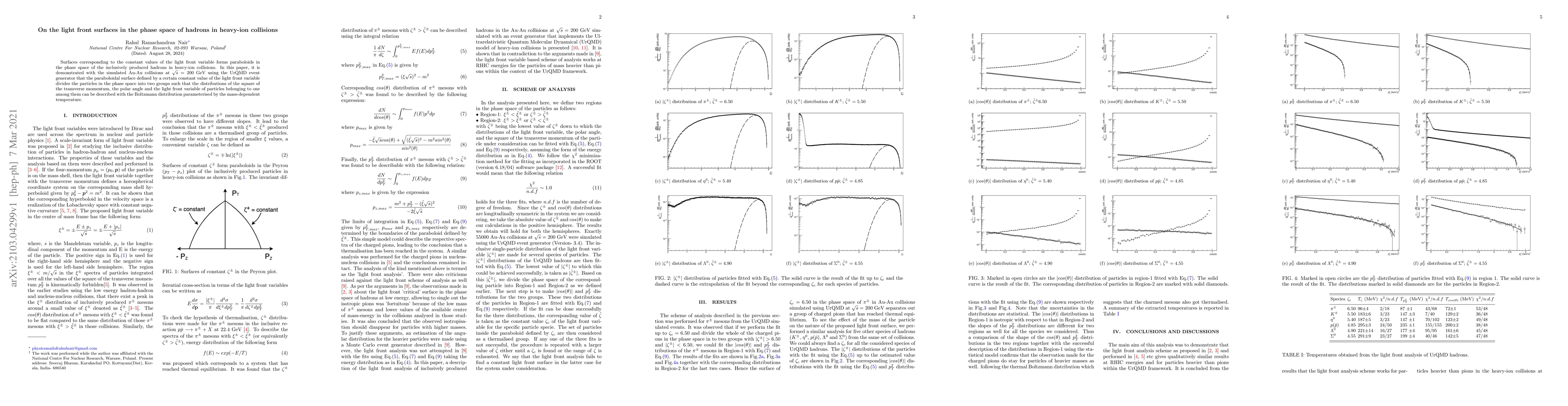 Surfaces corresponding to the constant values of the light front variable forms paraboloids in the phase space of the inclusively produced hadrons in heavy-ion collisions. In this paper, it is demonstrated with the simulated Au-Au collisions at $\sqrt{s} = 200$ GeV using the UrQMD event generator that the paraboloidal surface defined by a certain constant value of the light front variable divides the particles in the phase space into two groups such that the distributions of the square of the transverse momentum, the polar angle and the light front variable of particles belonging to one among them can be described with the Boltzmann distribution parameterised by the mass-dependent temperature.