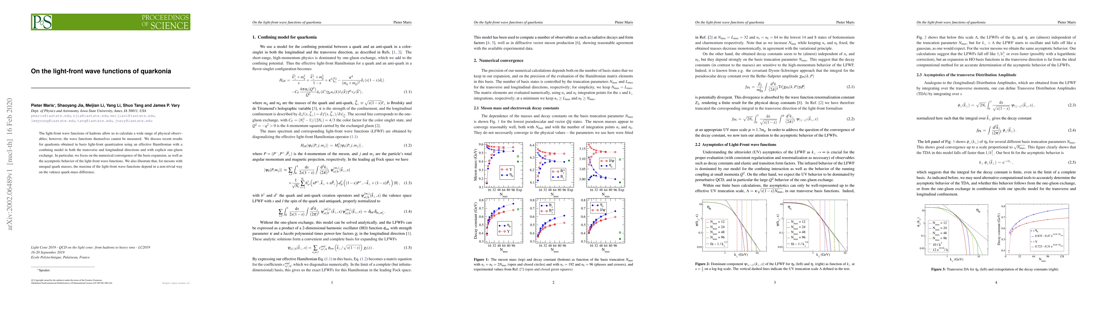 The light-front wave functions of hadrons allow us to calculate a wide range of physical observables; however, the wave functions themselves cannot be measured. We discuss recent results for quarkonia obtained in basis light-front quantization using an effective Hamiltonian with a confining model in both the transverse and longitudinal directions and with explicit one-gluon exchange. In particular, we focus on the numerical convergence of the basis expansion, as well as the asymptotic behavior of the light-front wave functions. We also illustrate that, for mesons with unequal quark masses, the maxima of the light-front wave functions depend in a non-trivial way on the valence quark-mass difference.