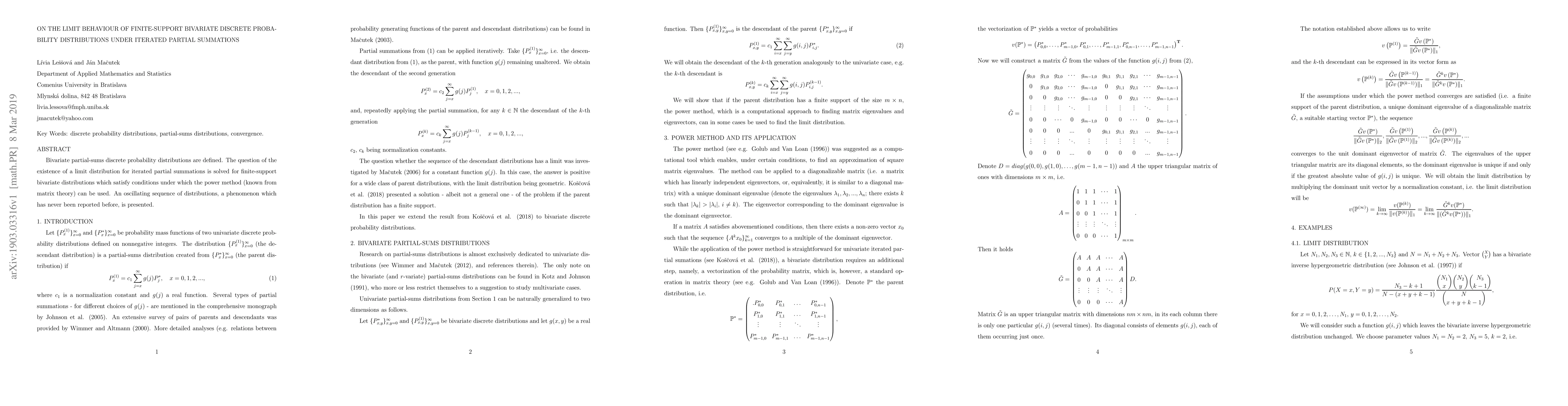 Bivariate partial-sums discrete probability distributions are defined. The question of the existence of a limit distribution for iterated partial summations is solved for finite-support bivariate distributions which satisfy conditions under which the power method (known from matrix theory) can be used. An oscillating sequence of distributions, a phenomenon which has never been reported before, is presented.