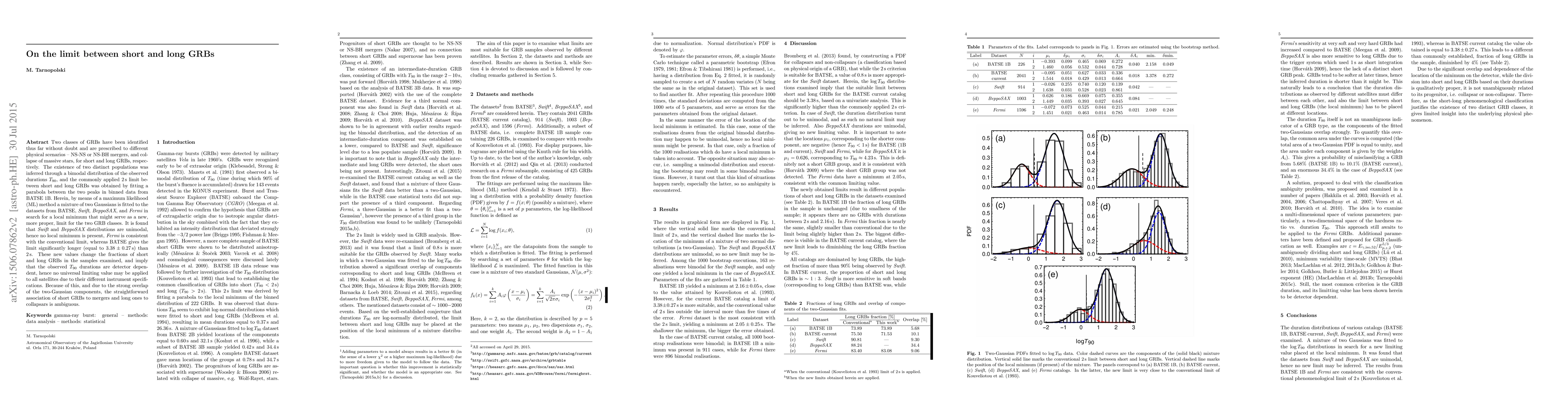 A study reevaluates the limit between short and long Gamma-Ray Bursts (GRBs), finding that the traditional $2 ext{s}$ threshold is not universally applicable due to detector dependencies.