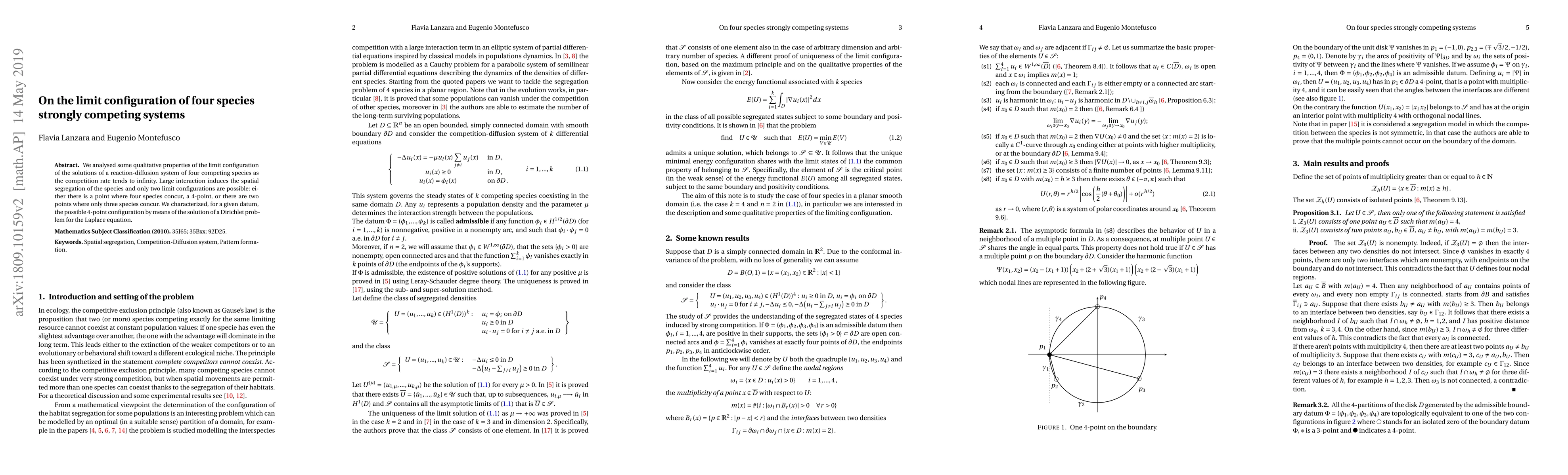 We analysed some qualitative properties of the limit configuration of the solutions of a reaction-diffusion system of four competing species as the competition rate tends to infinity. Large interaction induces the spatial segregation of the species and only two limit configurations are possible: either there is a point where four species concur, a 4-point, or there are two points where only three species concur. We characterized, for a given datum, the possible 4-point configuration by means of the solution of a Dirichlet problem for the Laplace equation.