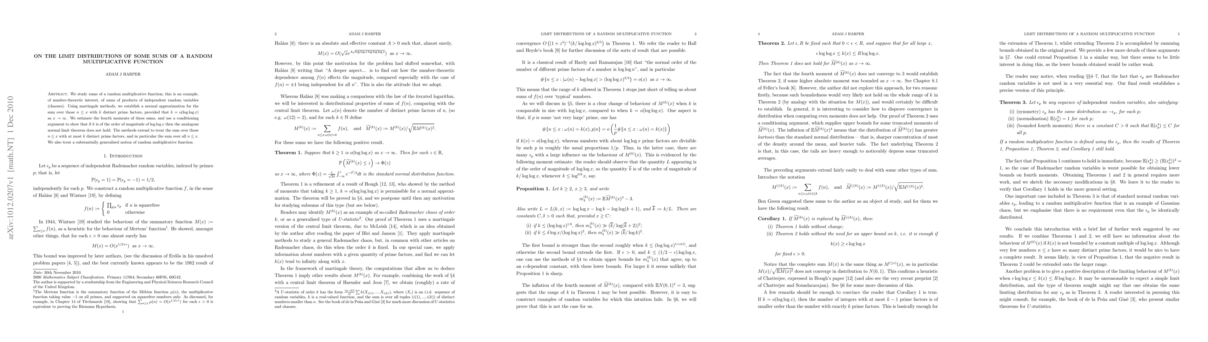 This paper investigates the limit distributions of sums involving a random multiplicative function, establishing a normal approximation for sums over integers with a specific number of distinct prime factors. It uses martingale methods and shows that normal approximation fails when the number of prime factors is of the order of magnitude of log log x.
