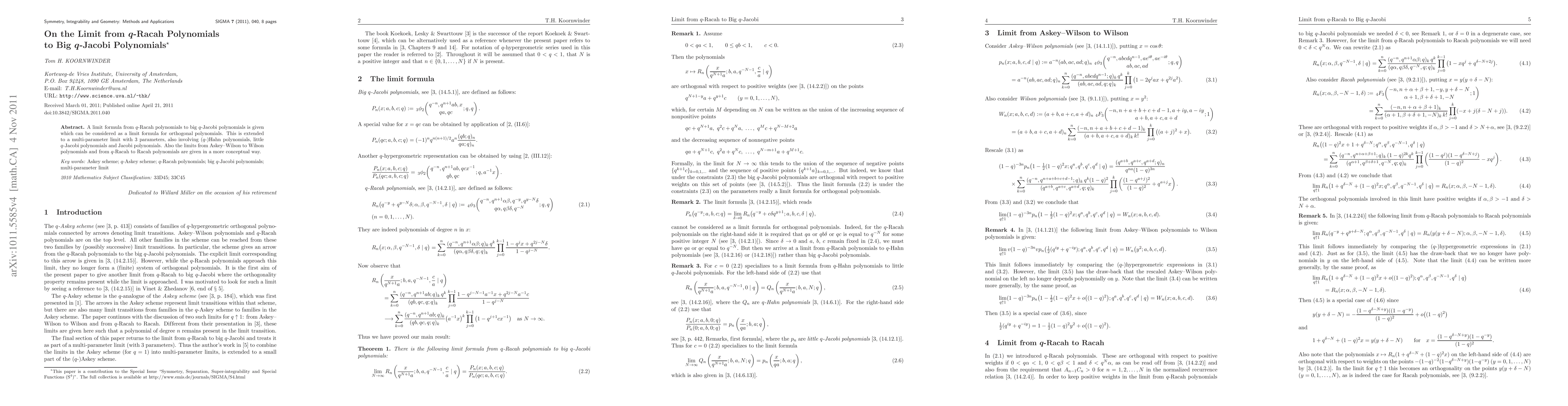 A limit formula from q-Racah polynomials to big q-Jacobi polynomials is given which can be considered as a limit formula for orthogonal polynomials. This is extended to a multi-parameter limit with 3 parameters, also involving (q-)Hahn polynomials, little q-Jacobi polynomials and Jacobi polynomials. Also the limits from Askey-Wilson to Wilson polynomials and from q-Racah to Racah polynomials are given in a more conceptual way.