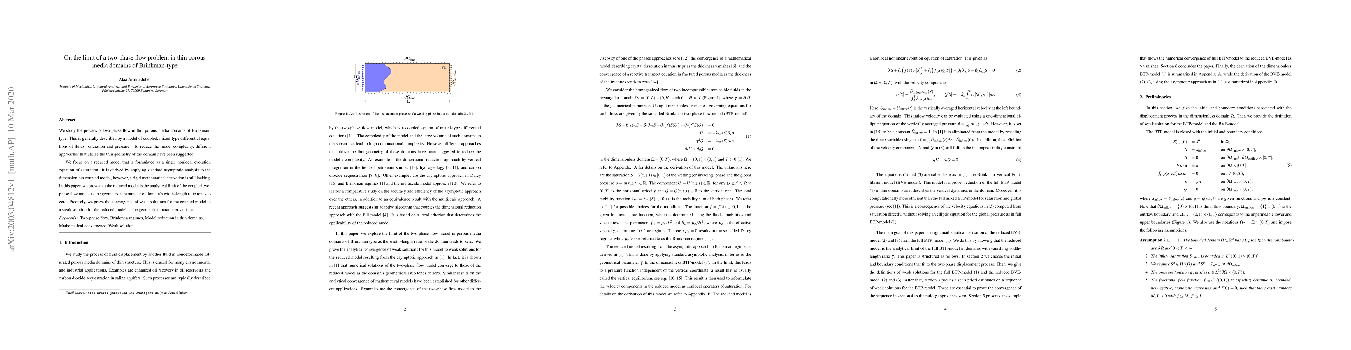 This paper investigates the two-phase flow in thin porous media domains of Brinkman-type, deriving a reduced model from a complex coupled differential equation system. It proves the analytical limit of the reduced model as the domain's width-to-length ratio approaches zero, demonstrating the convergence of weak solutions.