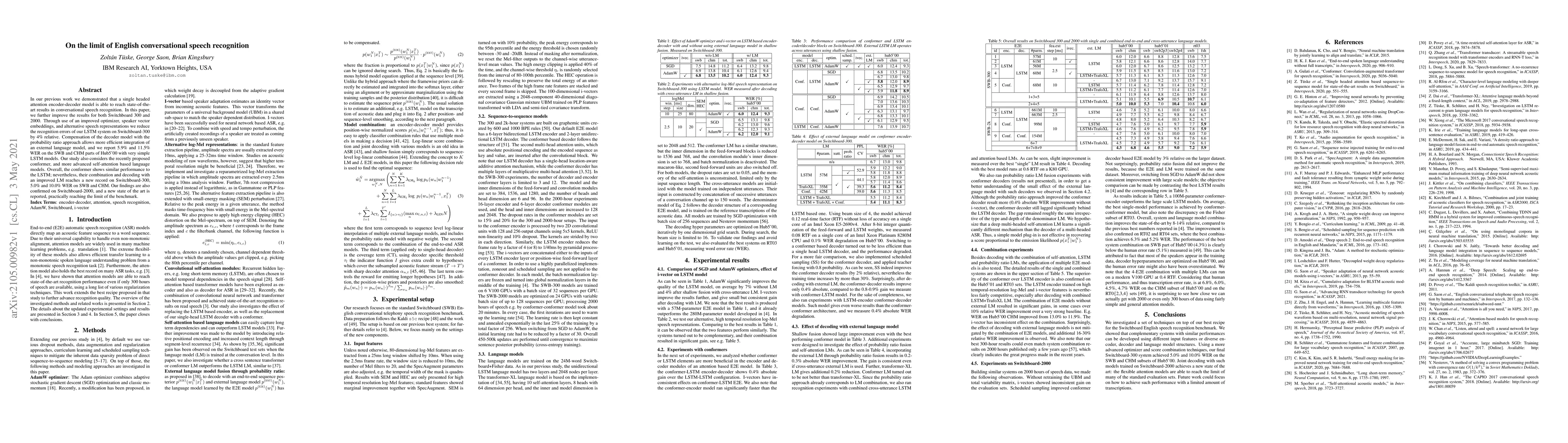 Researchers improved conversational speech recognition accuracy on two datasets, achieving state-of-the-art results with a combination of models including conformer and language models, reaching near-limits of the benchmark.