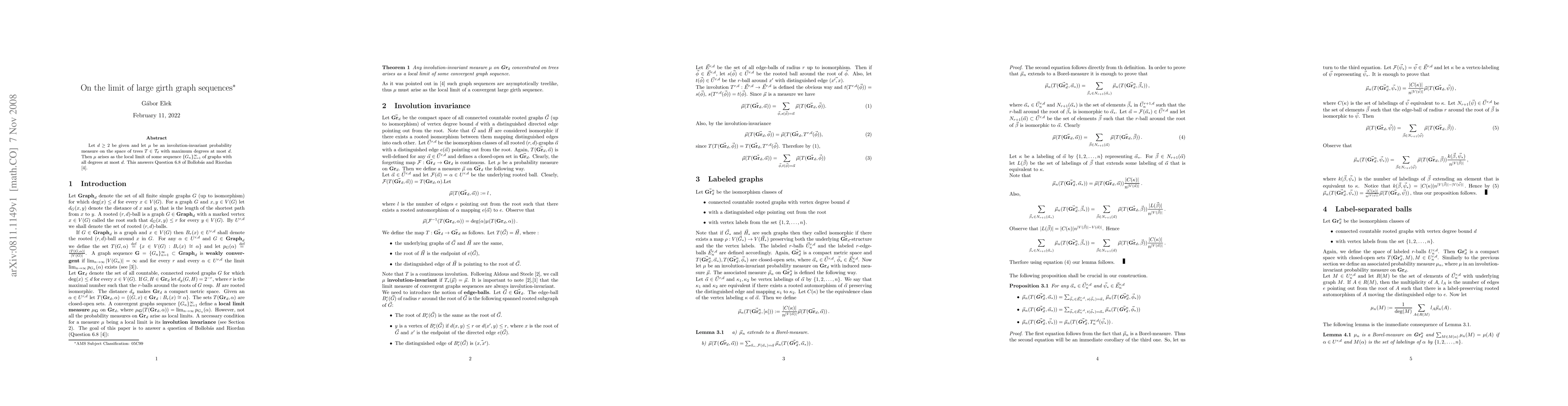 We prove that any involution-invariant probability measure on the space of trees with maximum degrees at most d arises as the local limit of a convergent large girth graph sequence. This answers a question of Bollobas and Riordan.