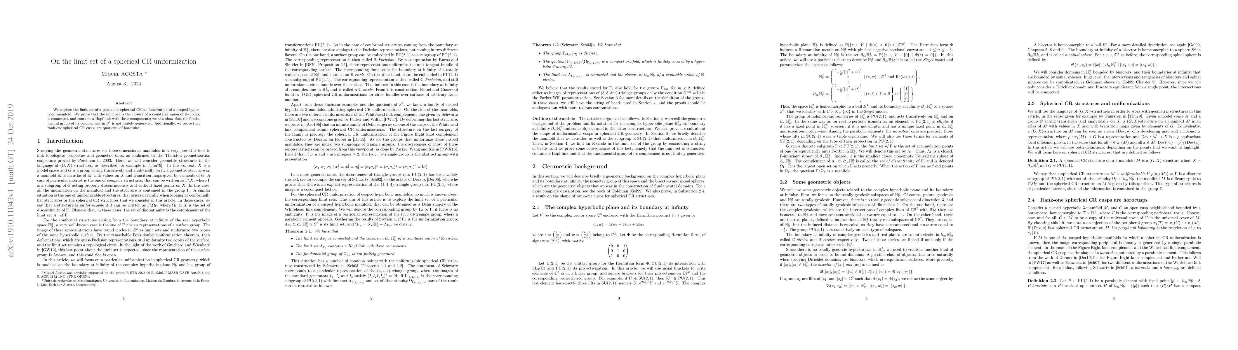 This paper investigates the limit set of a spherical CR uniformization of a cusped hyperbolic manifold, proving it is connected and contains a Hopf link with three components. It also demonstrates that the fundamental group of its complement in $S^3$ is not finitely generated and that rank-one spherical CR cusps are quotients of horotubes.