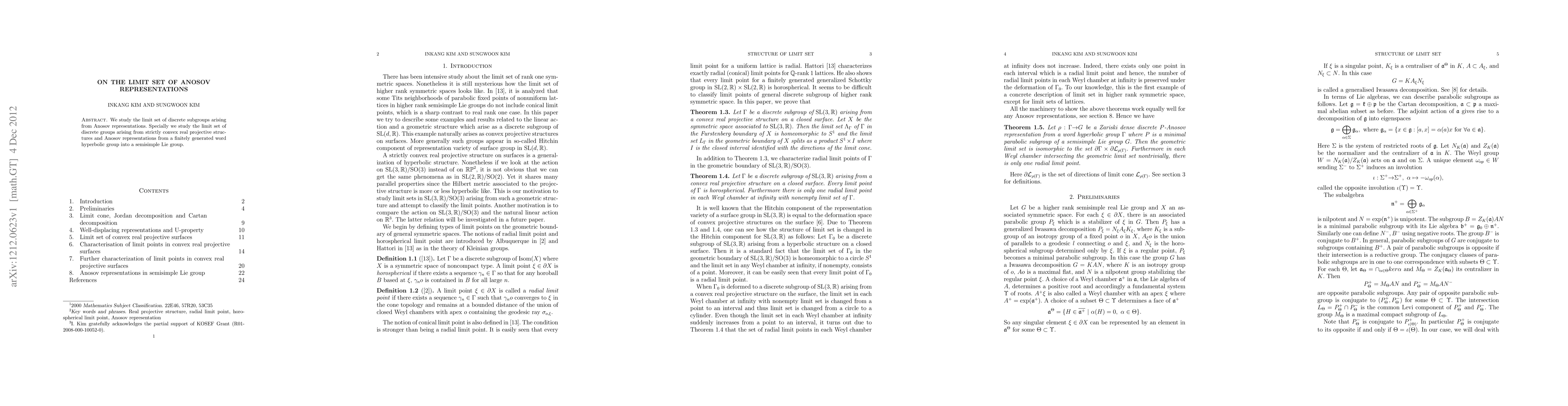 This paper studies the limit set of discrete subgroups from Anosov representations, focusing on strictly convex real projective structures and finitely generated word hyperbolic groups in semisimple Lie groups, exploring key properties and implications.