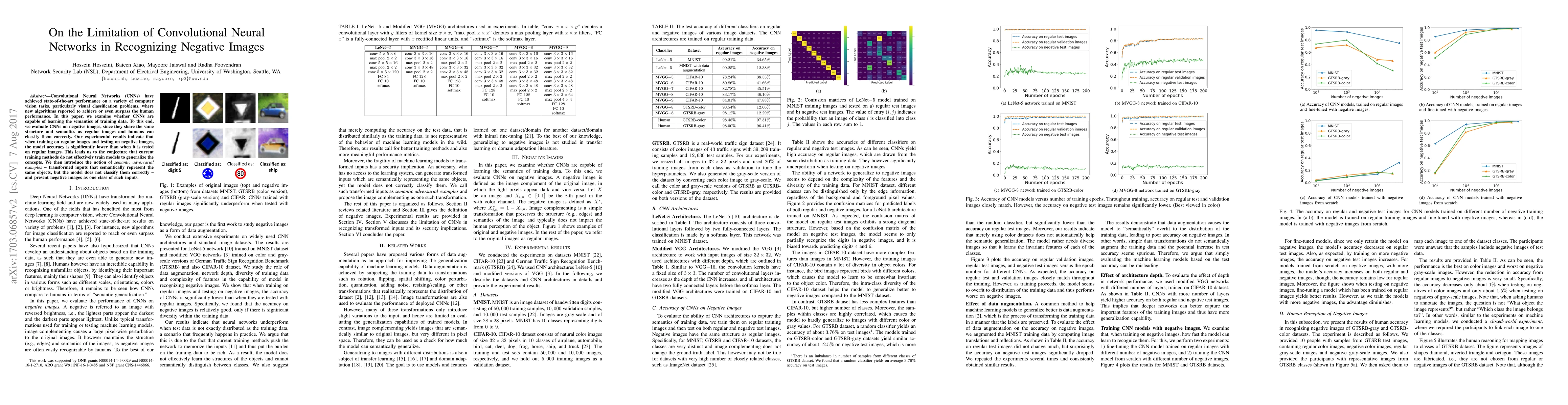 Convolutional Neural Networks (CNNs) have achieved state-of-the-art performance on a variety of computer vision tasks, particularly visual classification problems, where new algorithms reported to achieve or even surpass the human performance. In this paper, we examine whether CNNs are capable of learning the semantics of training data. To this end, we evaluate CNNs on negative images, since they share the same structure and semantics as regular images and humans can classify them correctly. Our experimental results indicate that when training on regular images and testing on negative images, the model accuracy is significantly lower than when it is tested on regular images. This leads us to the conjecture that current training methods do not effectively train models to generalize the concepts. We then introduce the notion of semantic adversarial examples - transformed inputs that semantically represent the same objects, but the model does not classify them correctly - and present negative images as one class of such inputs.