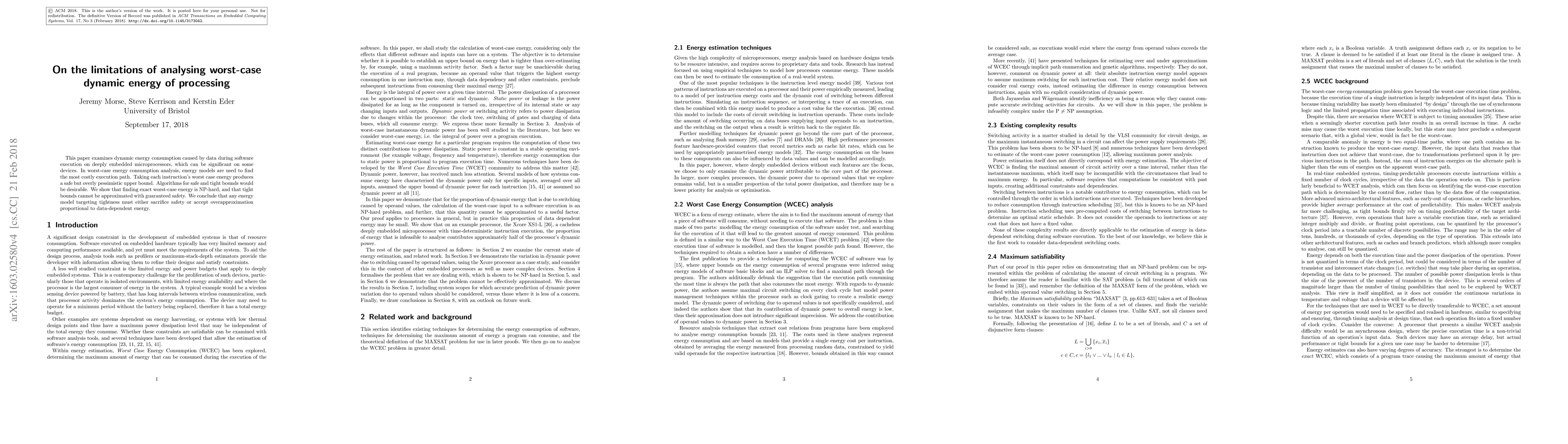 This paper demonstrates that determining the exact worst-case dynamic energy consumption during software execution on embedded microprocessors is NP-hard, and that achieving tight bounds cannot be safely approximated. Thus, energy models must compromise between precision and safety.