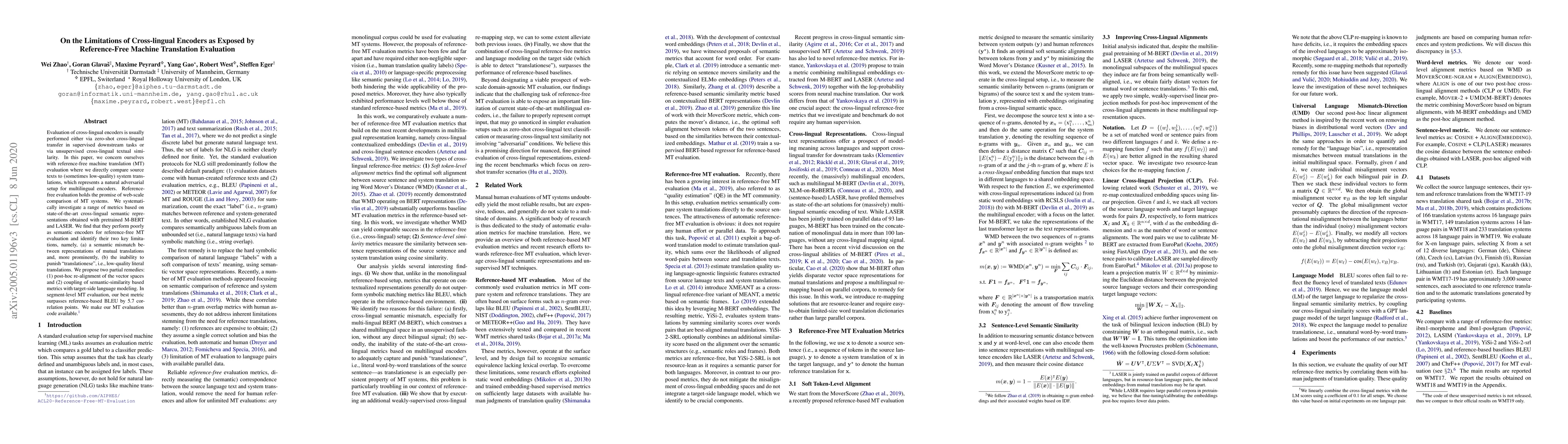 This paper investigates the limitations of cross-lingual encoders in reference-free machine translation evaluation, finding that they struggle with semantic mismatches and fail to penalize low-quality translations. The authors propose remedies including vector space re-alignment and combining semantic metrics with language modeling, achieving better segment-level MT evaluation results than reference-based BLEU.