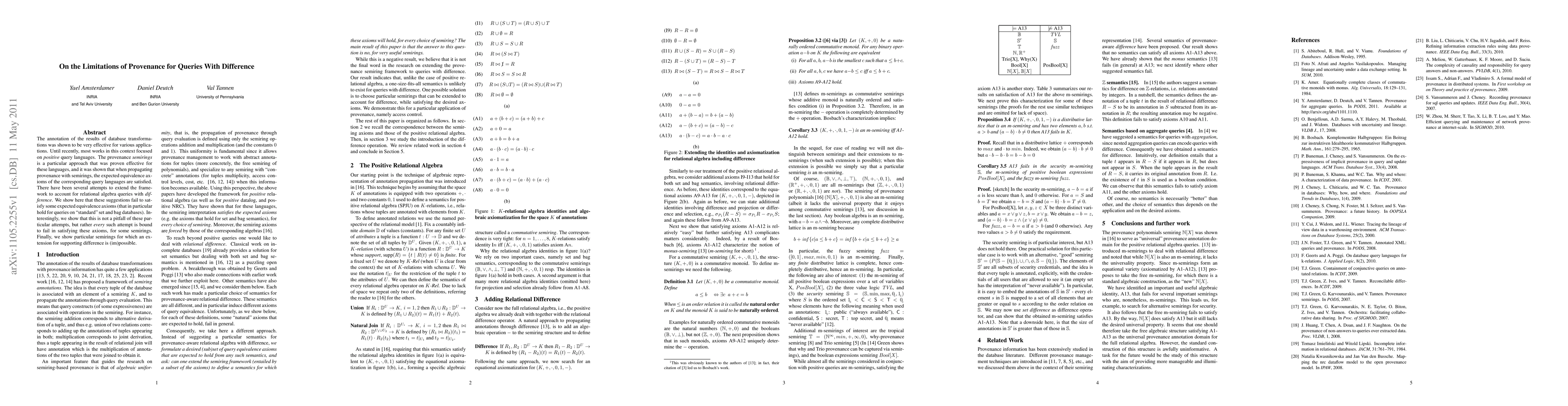This paper explores the limitations of using provenance semirings for relational algebra queries that involve difference operations, demonstrating that existing approaches fail to satisfy certain equivalence axioms. It concludes that no semiring-based extension can universally satisfy these axioms for all cases.