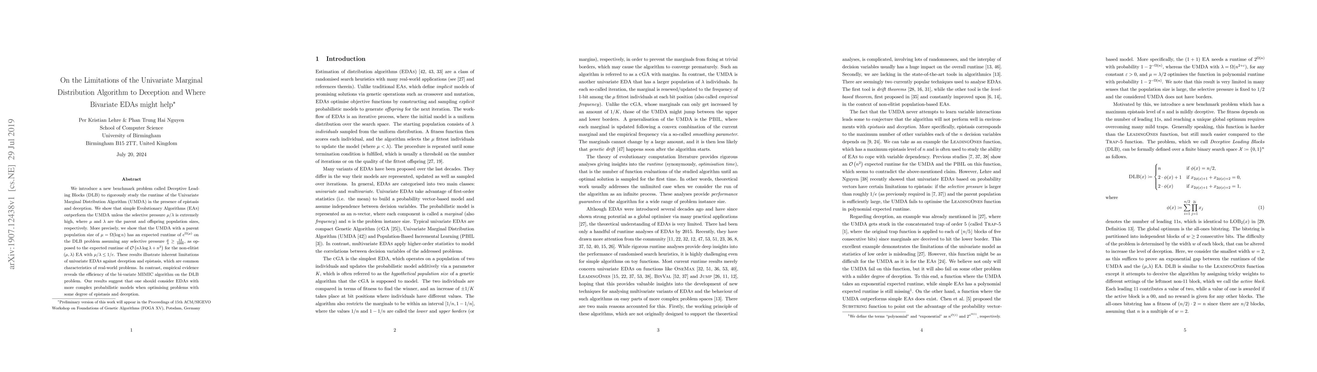 This paper introduces the Deceptive Leading Blocks (DLB) benchmark to study the Univariate Marginal Distribution Algorithm (UMDA) under epistasis and deception. It demonstrates that simple Evolutionary Algorithms outperform UMDA unless the selective pressure is extremely high, highlighting UMDA's limitations against these challenges. In contrast, the bi-variate MIMIC algorithm shows better performance, suggesting the need for more complex probabilistic models in optimization problems with epistasis and deception.