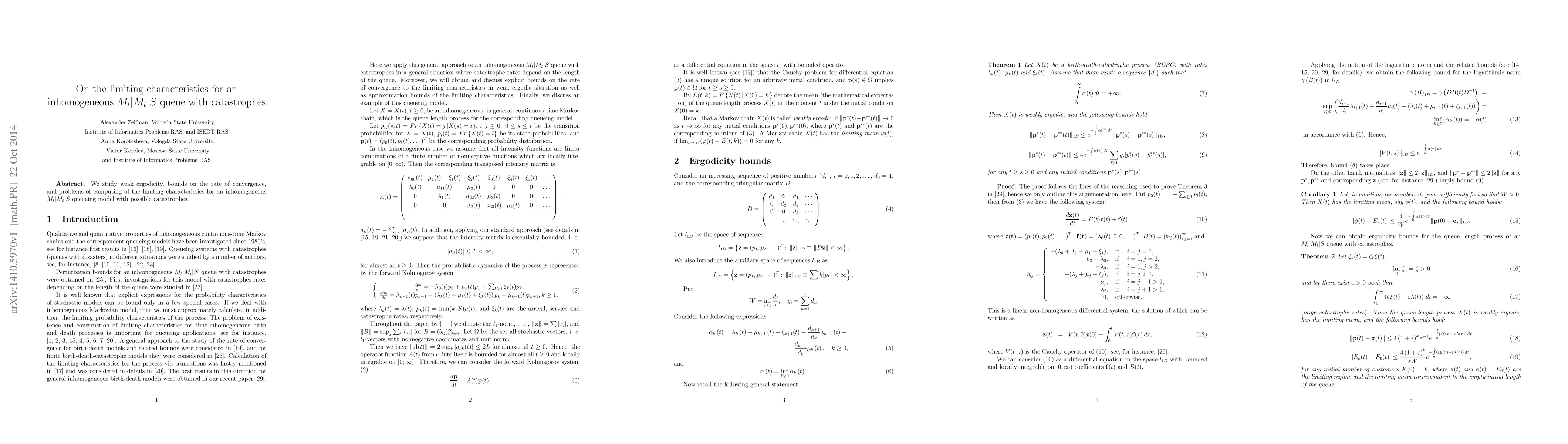 This paper investigates the weak ergodicity and convergence rates for an inhomogeneous $M_t|M_t|S$ queueing model that includes catastrophes, focusing on the computation of its limiting characteristics.