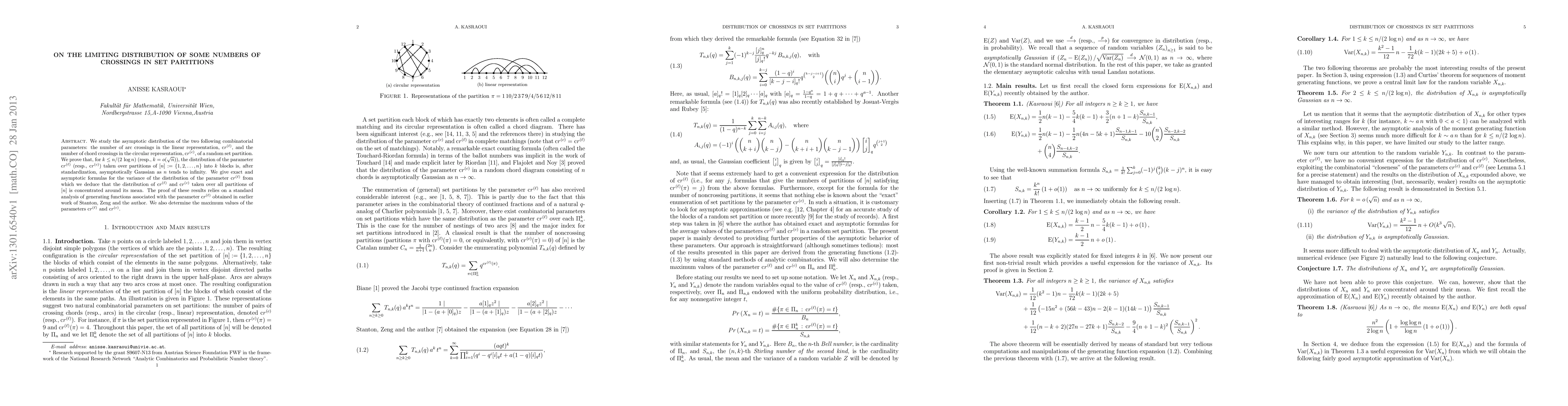 We study the asymptotic distribution of the two following combinatorial parameters: the number of arc crossings in the linear representation, ${\mathrm cr^{(\ell)}$, and the number of chord crossings in the circular representation, ${\mathrm cr^{(c)}$, of a random set partition. We prove that, for $k\leq n/(2\,\log n)$ (resp., ${k=o(\sqrt{n})}$), the distribution of the parameter ${\mathrm cr^{(\ell)}$ (resp., ${\mathrm cr^{(c)}$) taken over partitions of $[n]:=\{1,2,...,n\}$ into $k$ blocks is, after standardization, asymptotically Gaussian as $n$ tends to infinity. We give exact and asymptotic formulas for the variance of the distribution of the parameter ${\mathrm cr^{(\ell)}$ from which we deduce that the distribution of ${\mathrm cr^{(\ell)}$ and ${\mathrm cr^{(c)}$ taken over all partitions of $[n]$ is concentrated around its mean. The proof of these results relies on a standard analysis of generating functions associated with the parameter ${\mathrm cr^{(\ell)}$ obtained in earlier work of Stanton, Zeng and the author. We also determine the maximum values of the parameters ${\mathrm cr^{(\ell)}$ and ${\mathrm cr^{(c)}$.