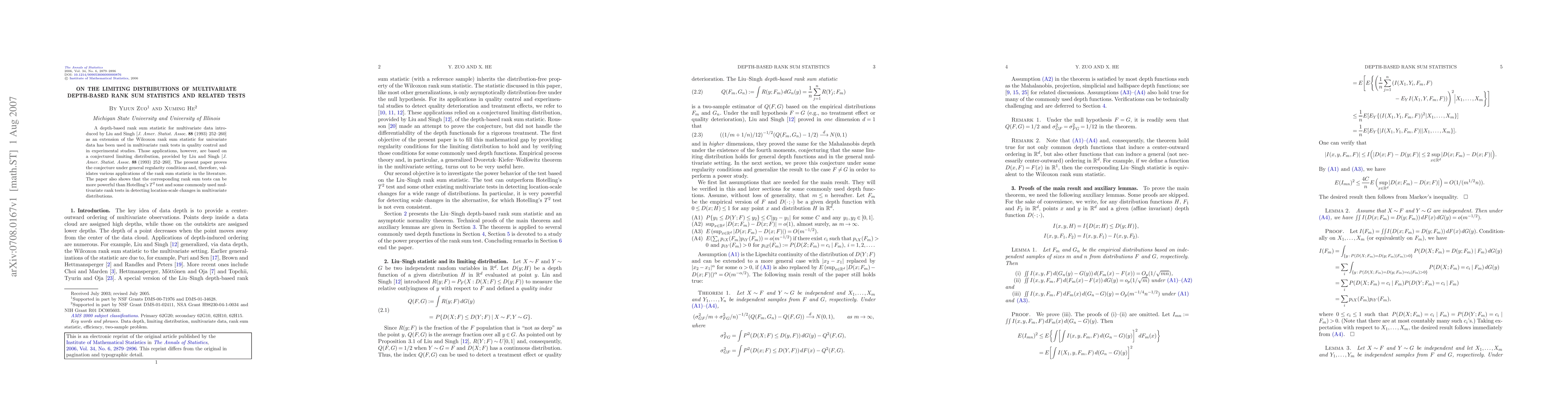 This paper proves the conjectured limiting distribution for Liu and Singh's multivariate depth-based rank sum statistic, validating its use in quality control and experimental studies. It also demonstrates that these rank sum tests can outperform Hotelling's T^2 test and other common multivariate rank tests in detecting location-scale changes.