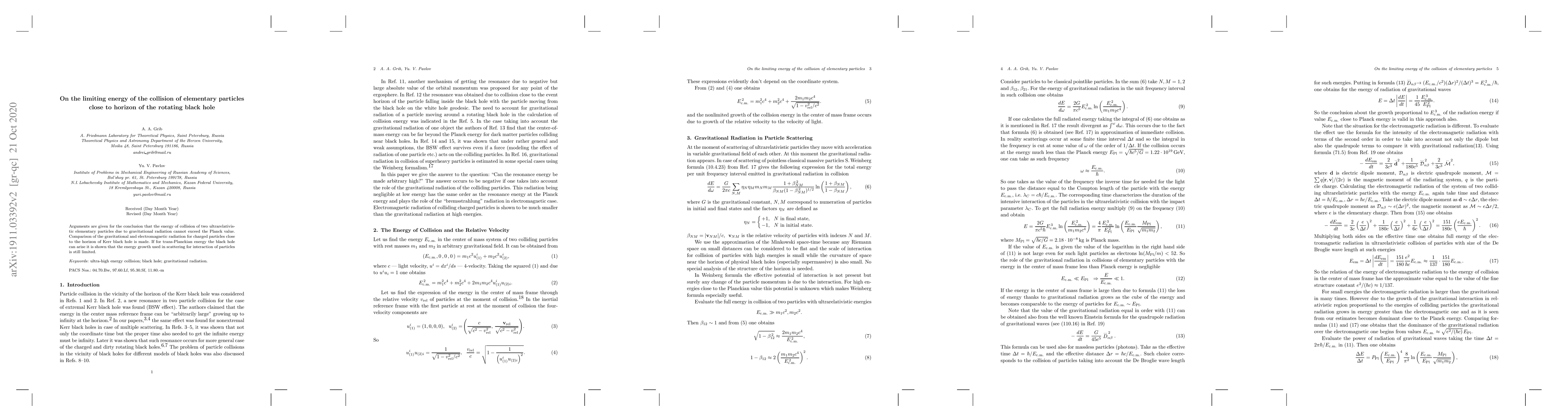 The paper argues that the energy from the collision of two ultrarelativistic particles near a Kerr black hole's horizon, considering gravitational radiation, cannot surpass the Planck value. It compares gravitational and electromagnetic radiation for charged particles and asserts that even if a black hole forms from trans-Planckian energy, the energy used in particle scattering remains limited.