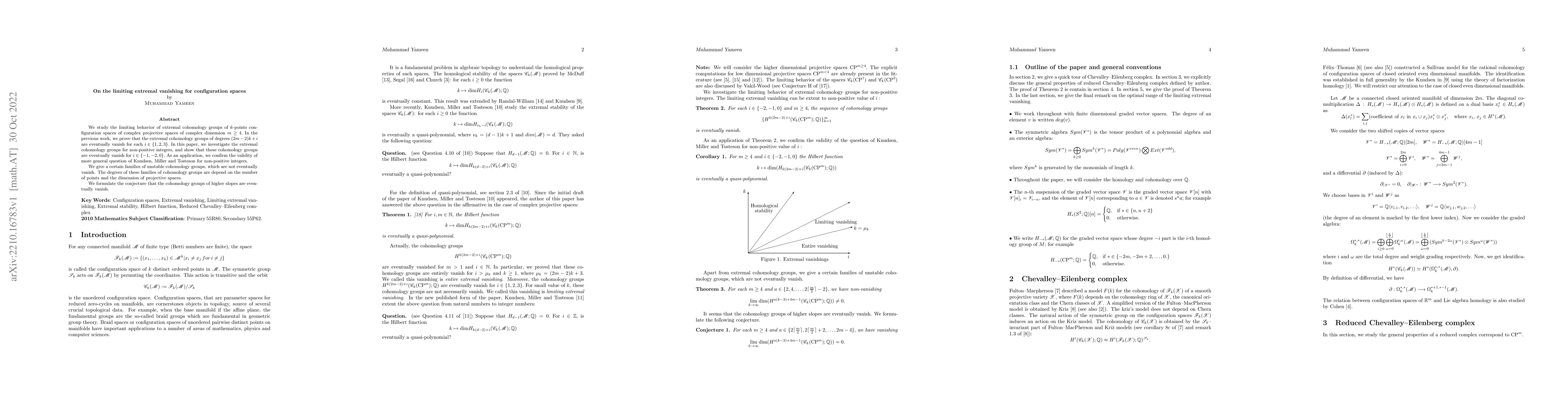 This paper explores the limiting behavior of extremal cohomology groups of configuration spaces of complex projective spaces, demonstrating that these groups eventually vanish for non-positive integer degrees. It confirms a general conjecture for non-positive integers and proposes a conjecture for higher slope cohomology groups.