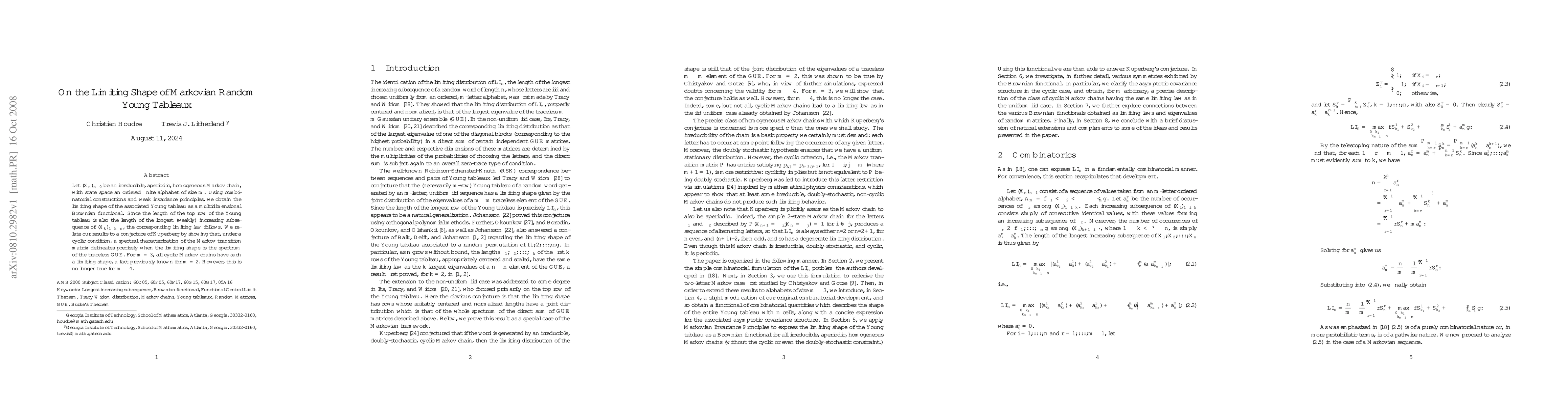 Let $(X_n)_{n \ge 0}$ be an irreducible, aperiodic, homogeneous Markov chain, with state space an ordered finite alphabet of size $m$. Using combinatorial constructions and weak invariance principles, we obtain the limiting shape of the associated Young tableau as a multidimensional Brownian functional. Since the length of the top row of the Young tableau is also the length of the longest (weakly) increasing subsequence of $(X_k)_{1\le k \le n}$, the corresponding limiting law follows. We relate our results to a conjecture of Kuperberg by showing that, under a cyclic condition, a spectral characterization of the Markov transition matrix delineates precisely when the limiting shape is the spectrum of the traceless GUE. For $m=3$, all cyclic Markov chains have such a limiting shape, a fact previously known for $m=2$. However, this is no longer true for $m \ge 4$.