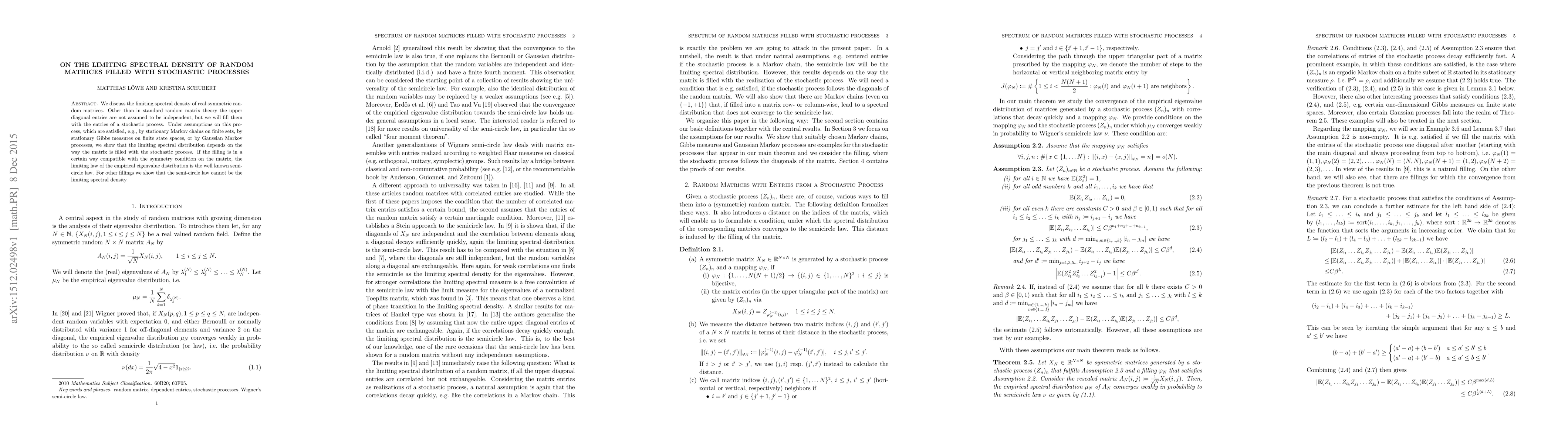 We discuss the limiting spectral density of real symmetric random matrices. Other than in standard random matrix theory the upper diagonal entries are not assumed to be independent, but we will fill them with the entries of a stochastic process. Under assumptions on this process, which are satisfied, e.g., by stationary Markov chains on finite sets, by stationary Gibbs measures on finite state spaces, or by Gaussian Markov processes, we show that the limiting spectral distribution depends on the way the matrix is filled with the stochastic process. If the filling is in a certain way compatible with the symmetry condition on the matrix, the limiting law of the empirical eigenvalue distribution is the well known semi-circle law. For other fillings we show that the semi-circle law cannot be the limiting spectral density.