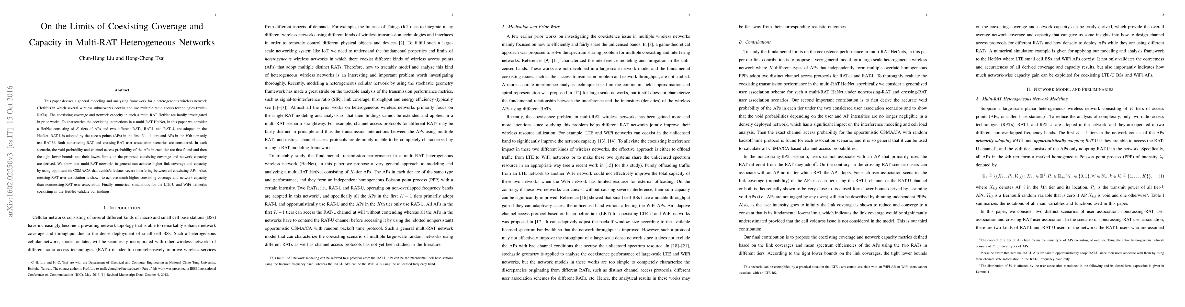 This paper develops a framework to analyze the interactions between coexisting coverage and capacity in multi-RAT heterogeneous networks, showing that crossing-RAT user association can significantly enhance network performance compared to noncrossing-RAT. Numerical simulations validate the theoretical findings for LTE-U and WiFi networks.