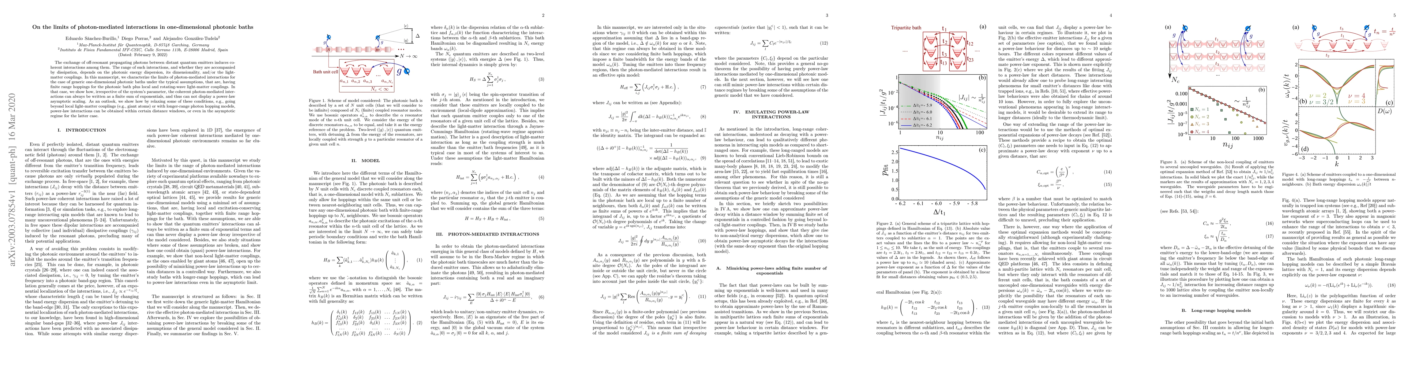 This paper explores the limits of photon-mediated interactions in one-dimensional photonic baths, showing that under typical assumptions, these interactions cannot exhibit power-law scaling. It suggests that relaxing certain conditions may enable power-law interactions over specific distances.