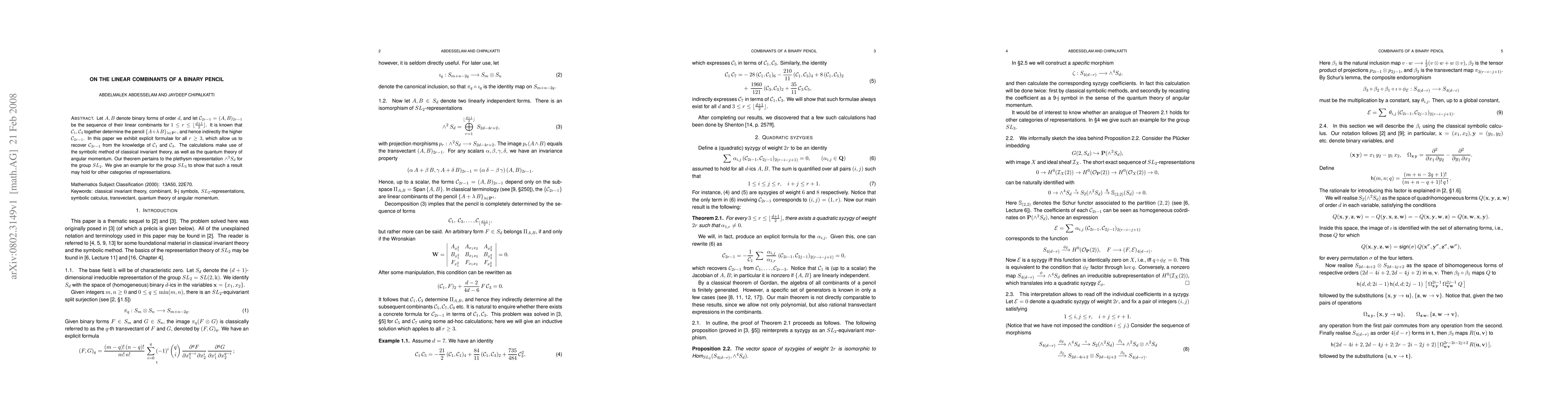 Let A,B denote binary forms of order d, and let C_{2r-1} = (A,B)_{2r-1} be the sequence of their linear combinants for r between 1 and (d+1)/2. It is known that C_1 and C_3 together determine the pencil generated by A and B, and hence indirectly the higher C_{2r-1}. In this paper we exhibit explicit formulae for all r>2, which allow us to recover C_{2r-1} from the knowledge of C_1 and C_3. The calculations make use of the symbolic method of classical invariant theory, as well as the quantum theory of angular momentum. Our theorem pertains to the second exterior power representation of S_d, for the group SL_2. We give an example for the group SL_3 to show that such a result may hold for other categories of representations.