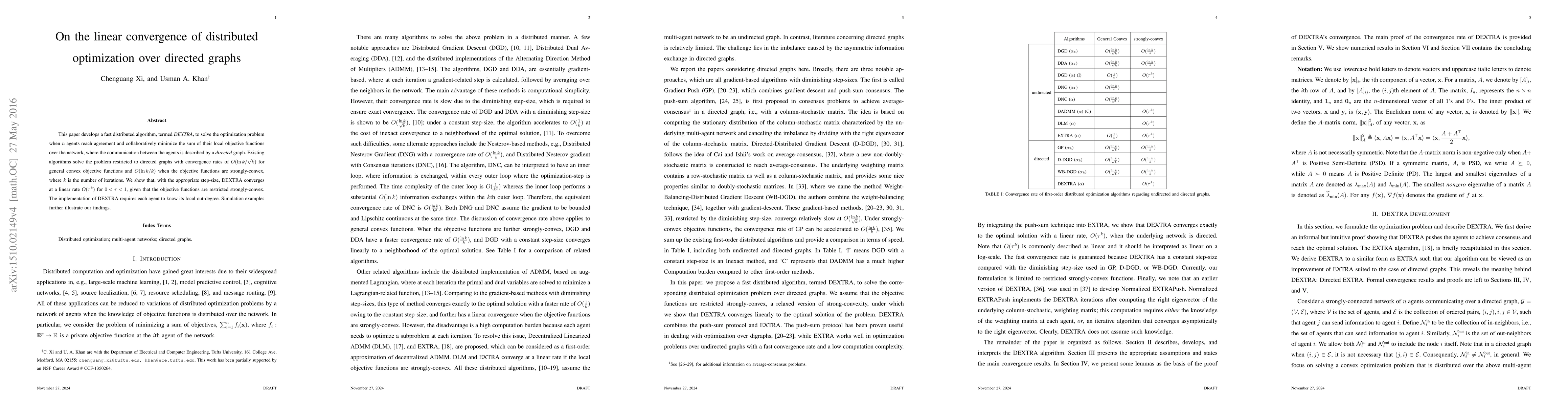 A new algorithm called DEXTRA achieves linear convergence in distributed optimization over directed graphs, outperforming existing methods with a faster rate of $O( au^k)$ for strongly-convex objective functions.