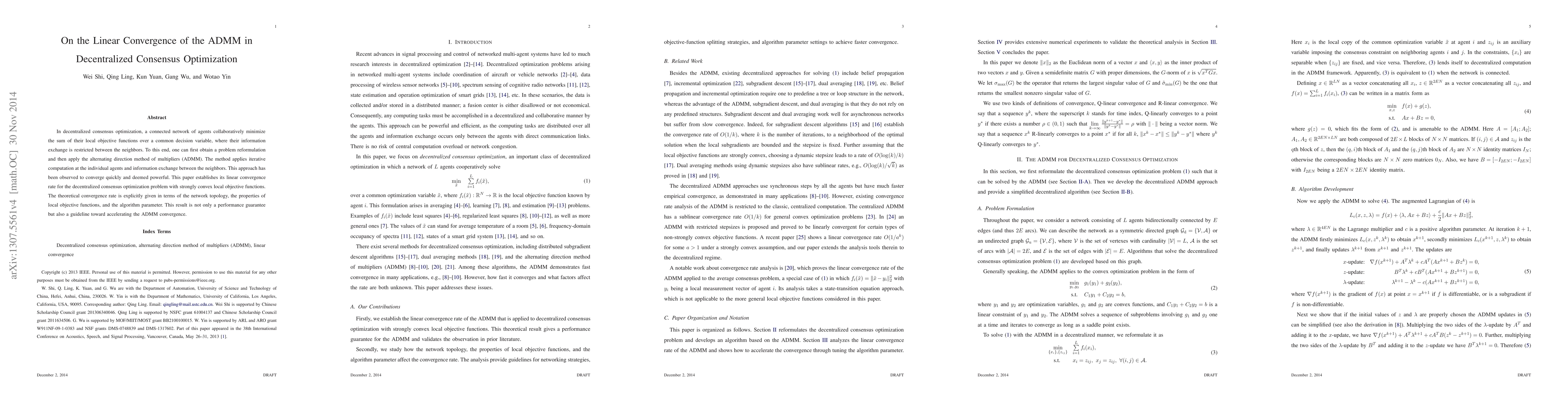 This paper establishes the linear convergence rate of the ADMM for decentralized consensus optimization, where agents minimize local objectives collaboratively. The convergence rate is explicitly given based on network topology, local objective properties, and algorithm parameters, providing both a performance guarantee and a guideline for accelerating convergence.