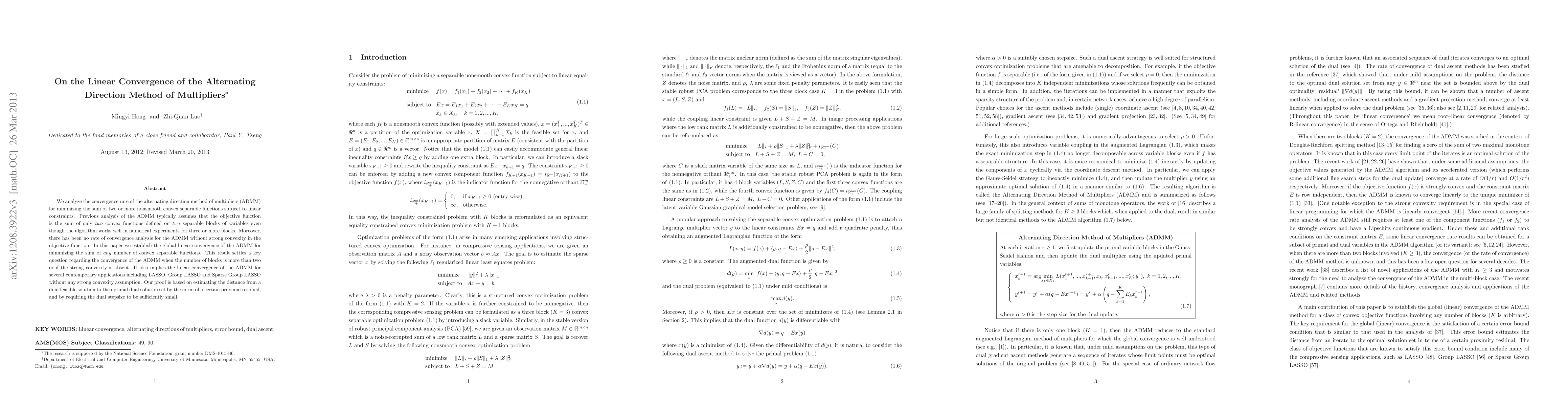 This paper establishes the global linear convergence of the ADMM for minimizing the sum of any number of convex separable functions, addressing previous limitations on the number of function blocks and the absence of strong convexity. The proof leverages the norm of a proximal residual and a sufficiently small dual stepsize.