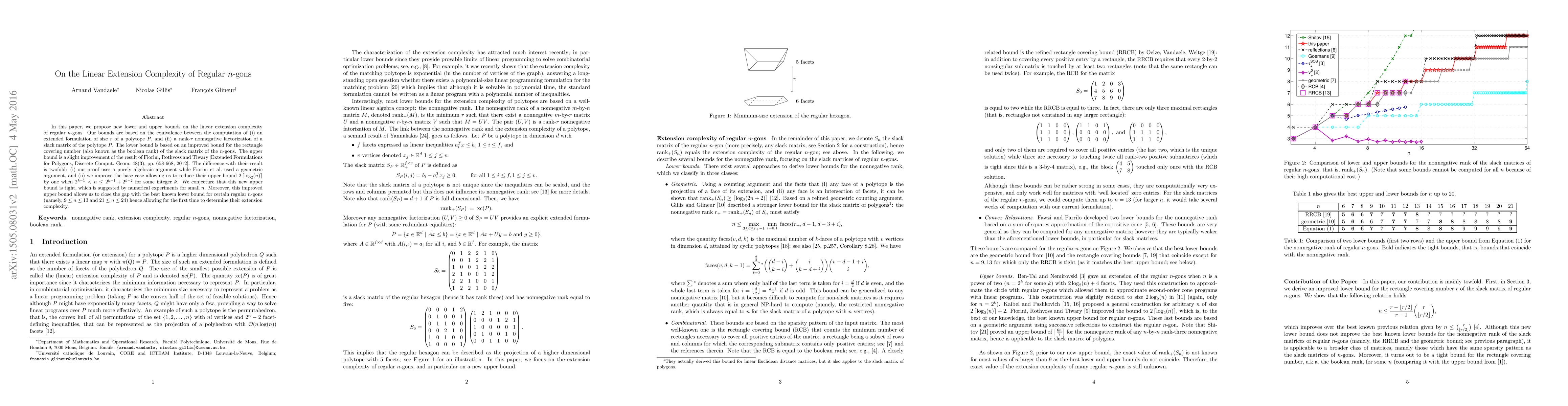 In this paper, we propose new lower and upper bounds on the linear extension complexity of regular $n$-gons. Our bounds are based on the equivalence between the computation of (i) an extended formulation of size $r$ of a polytope $P$, and (ii) a rank-$r$ nonnegative factorization of a slack matrix of the polytope $P$. The lower bound is based on an improved bound for the rectangle covering number (also known as the boolean rank) of the slack matrix of the $n$-gons. The upper bound is a slight improvement of the result of Fiorini, Rothvoss and Tiwary [Extended Formulations for Polygons, Discrete Comput. Geom. 48(3), pp. 658-668, 2012]. The difference with their result is twofold: (i) our proof uses a purely algebraic argument while Fiorini et al. used a geometric argument, and (ii) we improve the base case allowing us to reduce their upper bound $2 \left\lceil \log_2(n) \right\rceil$ by one when $2^{k-1} < n \leq 2^{k-1}+2^{k-2}$ for some integer $k$. We conjecture that this new upper bound is tight, which is suggested by numerical experiments for small $n$. Moreover, this improved upper bound allows us to close the gap with the best known lower bound for certain regular $n$-gons (namely, $9 \leq n \leq 13$ and $21 \leq n \leq 24$) hence allowing for the first time to determine their extension complexity.