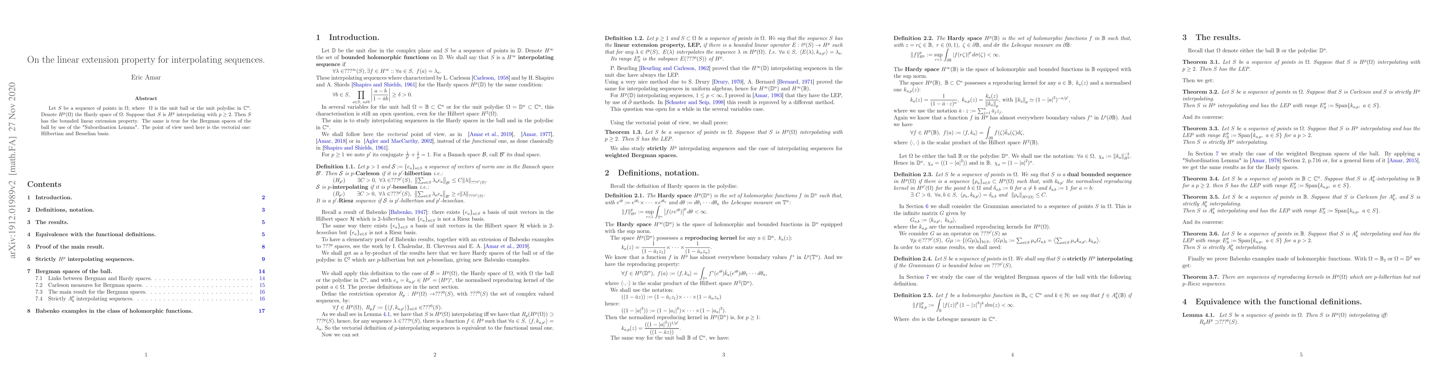 Let $S$ be a sequence of points in $\Omega ,$ where $\Omega$ is the unit ball or the unit polydisc in ${\mathbb{C}}^{n}.$ Denote $H^{p}$($\Omega $) the Hardy space of $\Omega .$ Suppose that $S$ is $H^{p}$ interpolating with $p\geq 2.$ Then $S$ has the bounded linear extension property. The same is true for the Bergman spaces of the ball by use of the "Subordination Lemma". The point of view used here is the vectorial one: Hilbertian and Besselian basis.