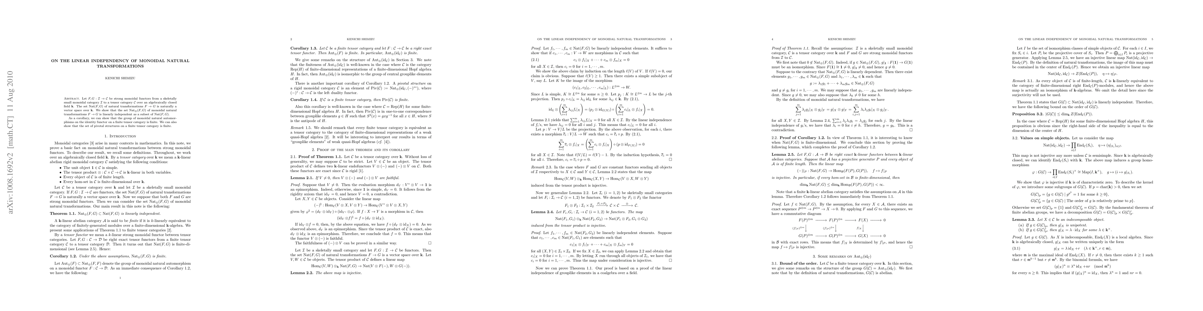Let $F, G: \mathcal{I} \to \mathcal{C}$ be strong monoidal functors from a skeletally small monoidal category $\mathcal{I}$ to a tensor category $\mathcal{C}$ over an algebraically closed field $k$. The set $Nat(F, G)$ of natural transformations $F \to G$ is naturally a vector space over $k$. We show that the set $Nat_\otimes(F, G)$ of monoidal natural transformations $F \to G$ is linearly independent as a subset of $Nat(F, G)$. As a corollary, we can show that the group of monoidal natural automorphisms on the identity functor on a finite tensor category is finite. We can also show that the set of pivotal structures on a finite tensor category is finite.
