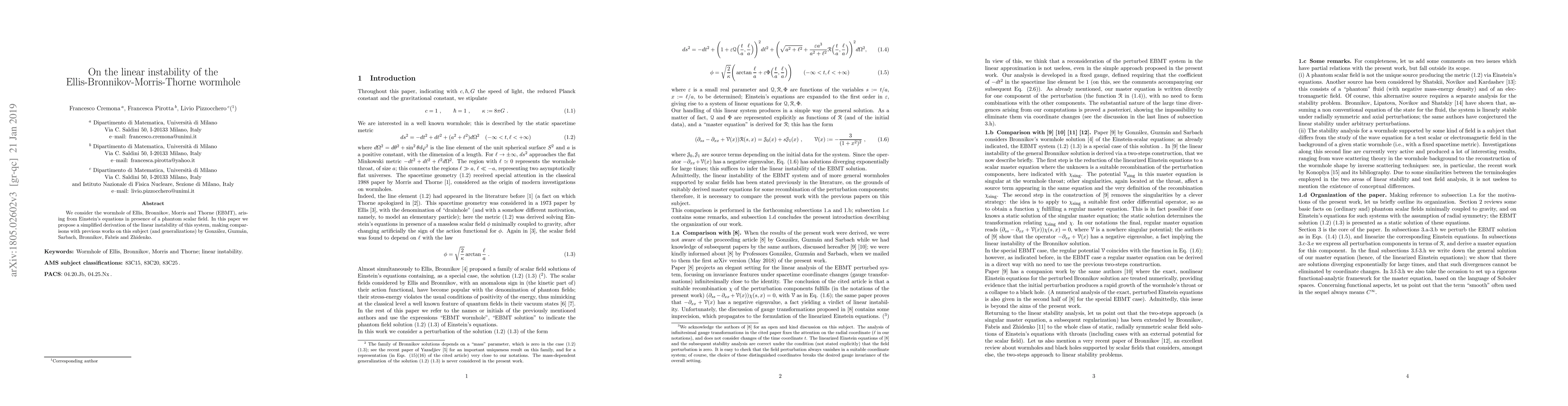 This paper investigates the linear instability of the Ellis-Bronnikov-Morris-Thorne (EBMT) wormhole, derived from Einstein's equations with a phantom scalar field, and presents a simplified derivation method, comparing it with prior studies by Gonzalez, Guzman, Sarbach, Bronnikov, Fabris, and Zhidenko.