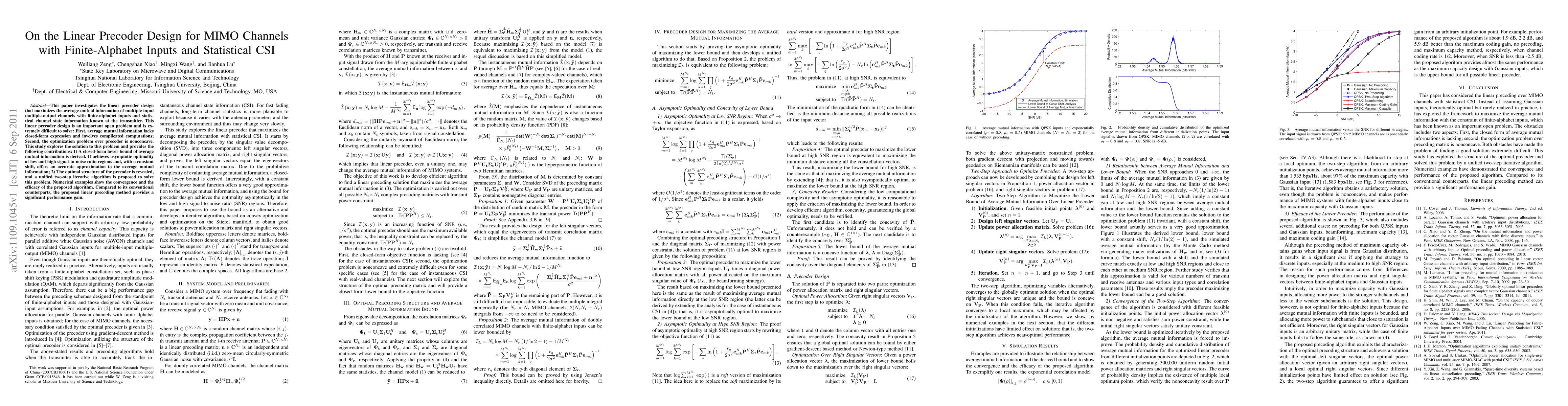 This paper investigates the design of linear precoders for MIMO channels with finite-alphabet inputs and statistical CSI, proposing a closed-form lower bound for average mutual information and a two-step iterative algorithm to achieve optimal precoding, demonstrating significant performance gains over conventional methods.