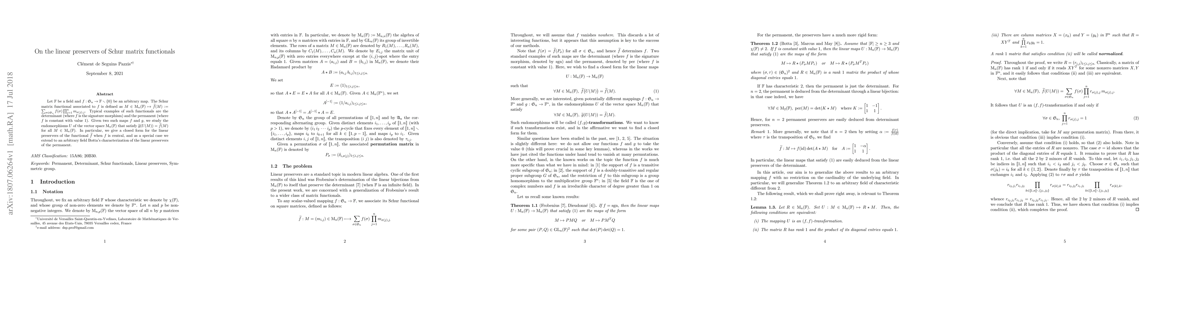 Let $\mathbb{F}$ be a field and $f : \mathfrak{S}_n \rightarrow \mathbb{F} \setminus \{0\}$ be an arbitrary map. The Schur matrix functional associated to $f$ is defined as $M \in \text{M}_n(\mathbb{F}) \mapsto \widetilde{f}(M):=\sum_{\sigma \in \mathfrak{S}_n} f(\sigma) \prod_{j=1}^n m_{\sigma(j),j}$. Typical examples of such functionals are the determinant (where $f$ is the signature morphism) and the permanent (where $f$ is constant with value $1$). Given two such maps $f$ and $g$, we study the endomorphisms $U$ of the vector space $\text{M}_n(\mathbb{F})$ that satisfy $\widetilde{g}(U(M))=\widetilde{f}(M)$ for all $M \in \text{M}_n(\mathbb{F})$. In particular, we give a closed form for the linear preservers of the functional $\widetilde{f}$ when $f$ is central, and as a special case we extend to an arbitrary field Botta's characterization of the linear preservers of the permanent.