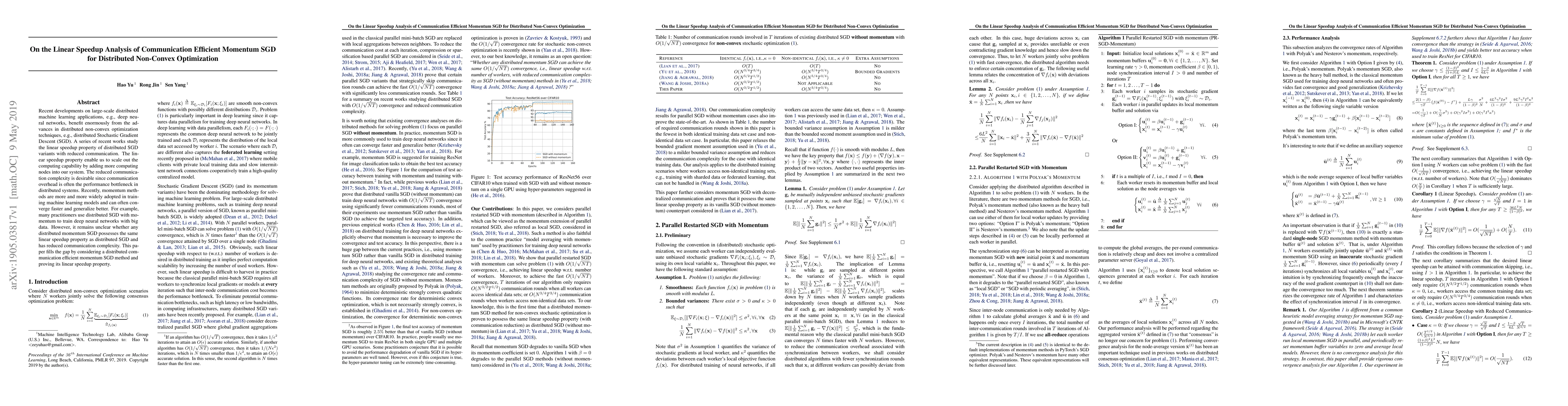 This paper investigates a distributed communication-efficient variant of momentum Stochastic Gradient Descent (SGD) for large-scale non-convex optimization, demonstrating its linear speedup property and reduced communication complexity, addressing a gap in existing research on distributed momentum SGD methods.