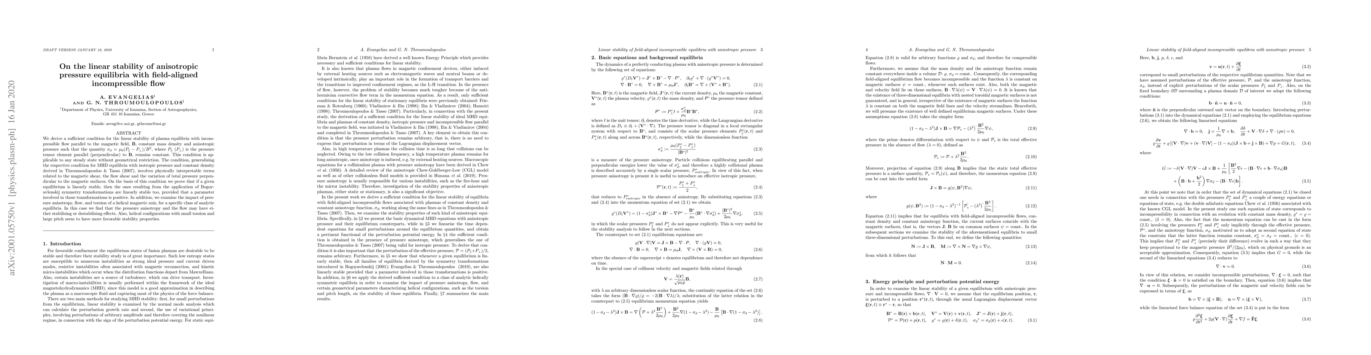 The research employs an energy principle to derive a sufficient condition for the linear stability of plasma equilibria with field-aligned incompressible flow, constant mass density, and anisotropic pressure. It generalizes the condition for MHD equilibria with isotropic pressure and constant density.