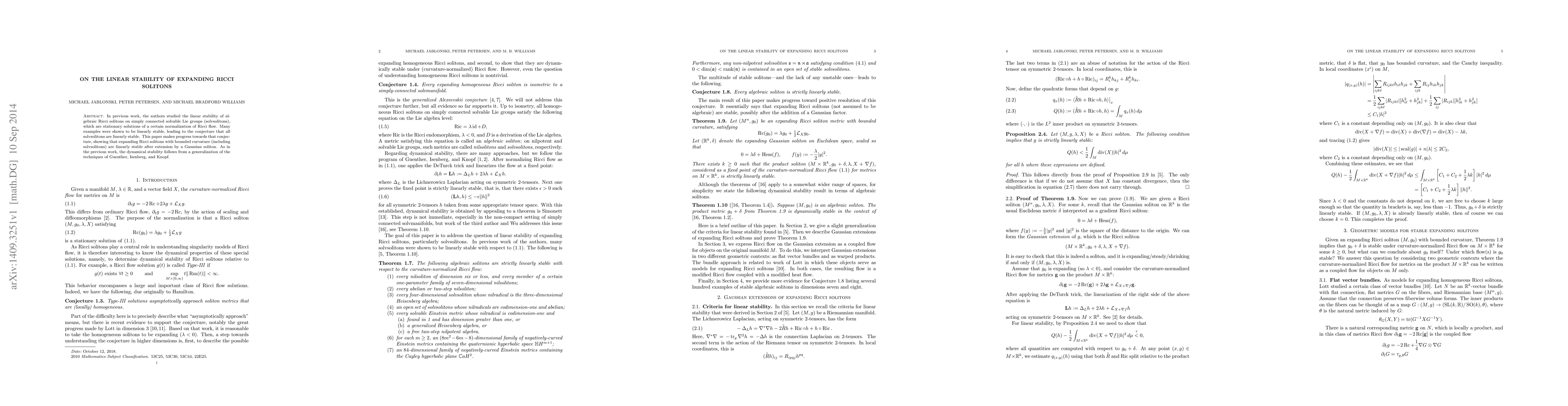 In previous work, the authors studied the linear stability of algebraic Ricci solitons on simply connected solvable Lie groups (solvsolitons), which are stationary solutions of a certain normalization of Ricci flow. Many examples were shown to be linearly stable, leading to the conjecture that all solvsolitons are linearly stable. This paper makes progress towards that conjecture, showing that expanding Ricci solitons with bounded curvature (including solvsolitons) are linearly stable after extension by a Gaussian soliton. As in the previous work, the dynamical stability follows from a generalization of the techniques of Guenther, Isenberg, and Knopf.