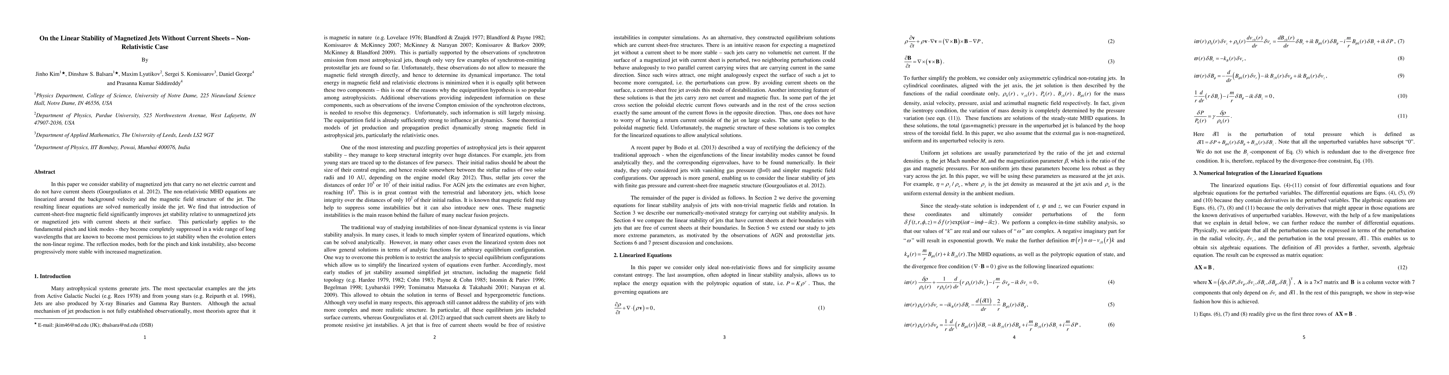 This paper investigates the stability of non-relativistic magnetized jets without current sheets using linearized MHD equations. Numerical solutions show that such jets are significantly more stable than unmagnetized or current-sheet-containing jets, particularly suppressing fundamental pinch and kink modes over long wavelengths.
