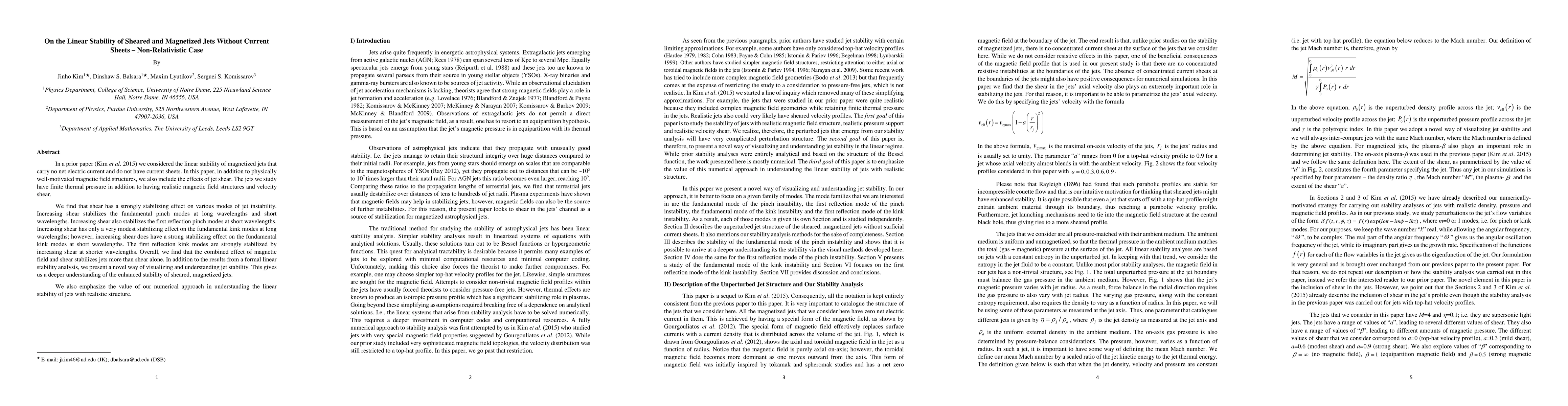 This paper investigates the linear stability of sheared, magnetized jets without current sheets, finding that shear strongly stabilizes various instability modes, especially at short wavelengths. The combined effect of magnetic fields and shear provides enhanced stability compared to shear alone.