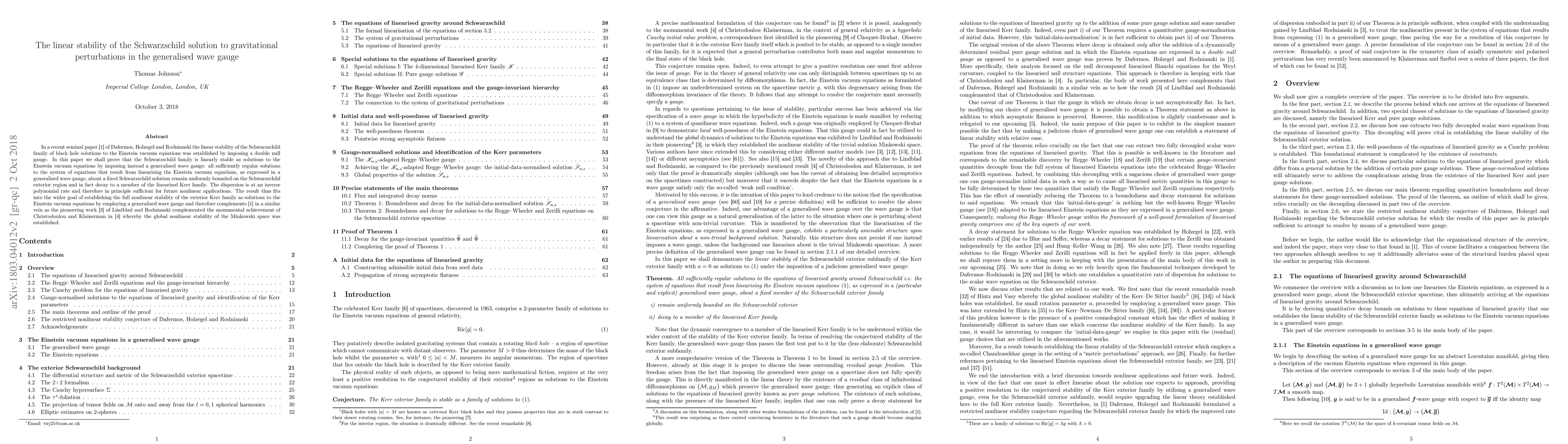 This paper proves the linear stability of the Schwarzschild family of black hole solutions to the Einstein vacuum equations by employing a generalised wave gauge, showing that perturbations remain uniformly bounded and decay to a member of the linearised Kerr family at an inverse polynomial rate. This complements previous work establishing stability in different gauges and contributes to the broader goal of nonlinear stability of the Kerr family.