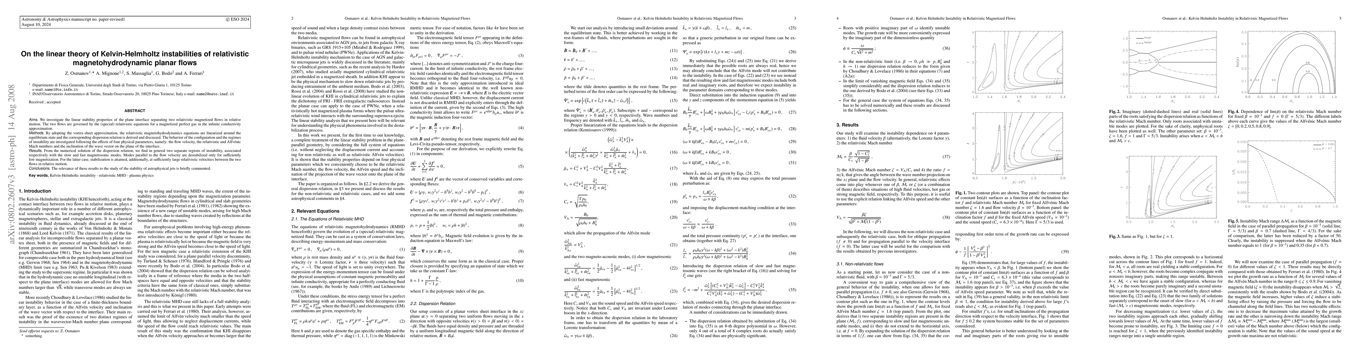 We investigate the linear stability properties of the plane interface separating two relativistic magnetized flows in relative motion. The two flows are governed by the (special) relativistic equations for a magnetized perfect gas in the infinite conductivity approximation. By adopting the vortex-sheet approximation, the relativistic magnetohydrodynamics equations are linearized around the equilibrium state and the corresponding dispersion relation is derived and discussed. The behavior of the configuration and the regimes of instability are investigated following the effects of four physical parameters, namely: the flow velocity, the relativistic and Alfv\'enic Mach numbers and the inclination of the wave vector on the plane of the interface. From the numerical solution of the dispersion relation, we find in general two separate regions of instability, associated respectively with the slow and fast magnetosonic modes. Modes parallel to the flow velocity are destabilized only for sufficiently low magnetization. For the latter case, stabilization is attained, additionally, at sufficiently large relativistic velocities between the two flows in relative motion. The relevance of these results to the study of the stability of astrophysical jets is briefly commented.